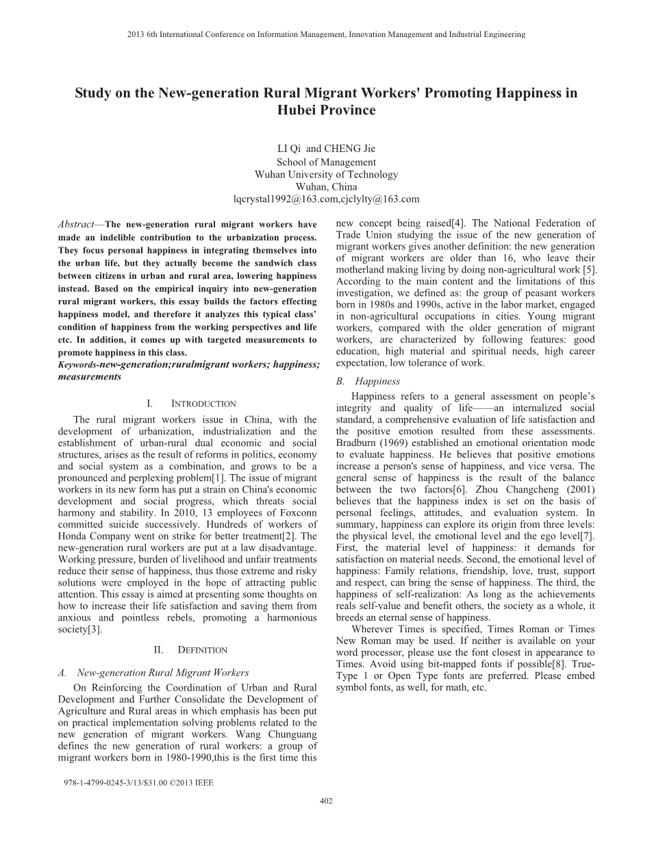 摘要:新生代农民工对城镇化进程做出了不可磨灭的贡献。他们在融入城市生活过程中注重个人幸福,但实际上却成为城乡居民之间的夹心阶层,降低了幸福感。本文在对新生代农民工进行实证调查的基础上,构建了影响新生代农民工幸福感的因素模型,并从工作、生活等方面分析了这一典型阶层的幸福感状况。