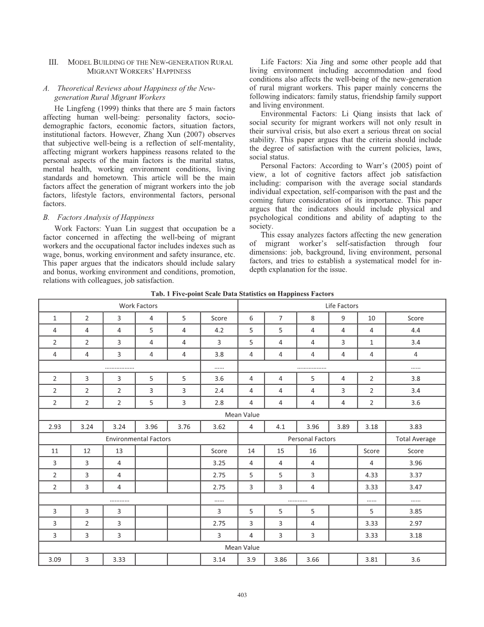 生活因素夏静等人补充说,居往环境,包括住宿和食物条件也影响着新生代农民工的幸福感。本文主要关注以下几个指标:家庭状况、朋辈状况、家庭支持和生活环境。