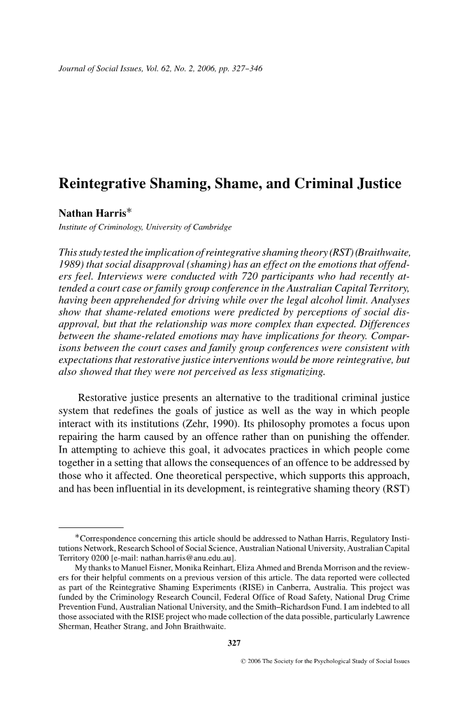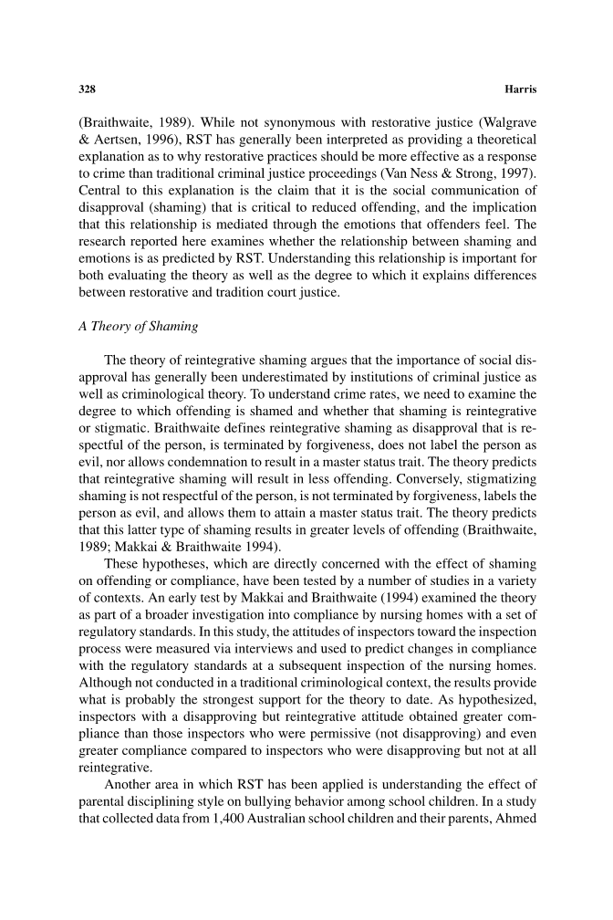 恢复性司法是对传统刑事司法体系的一种替代,它重新定义了司法的目标以及人们与司法机构互动的方式(Zehr, 1990)。它的哲学提倡把重点放在弥补罪行所造成的损害上,而不是惩罚犯罪者。为了实现这一目标,它提倡人们在一种环境中走到一起,使一项罪行的后果由受其影响的人来处理。支持这一方法并对其发展产生影响的一个理论视角是再整合羞辱理论(RST)(布雷斯韦特,1989)。虽然RST不是恢复性司法的同义词(Walgrave amp; Aertsen, 1996),但它通常被解读为提供了一个理论解释,解释为什么恢复性实践应该比传统刑事司法程序更有效地应对犯罪(Van Nessamp;Strong,1997)。这一解释的核心是这样一种说法,即不赞成(羞辱)的社会交流对减少犯罪至关重要,而这种关系是通过罪犯的情感来调节的。这里报道的研究调查了羞耻和情绪之间的关系是否像RST预测的那样。理解这一关系对于评估这一理论以及它在多大程度上解释恢复性和传统法院司法之间的差异都很重要。