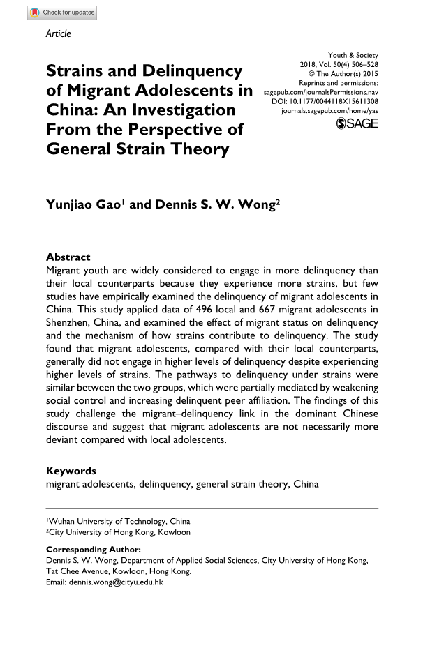 人们普遍认为,外来务工青少年比当地的同龄人更容易犯罪,因为他们承受着更多的压力,但很少有研究对中国外来务工青少年的犯罪进行实证研究。本研究以深圳市496名本地青少年和667名外来务工人员青少年为研究对象,研究外来务工人员身份对青少年犯罪的影响,以及压力对青少年犯罪的影响机制。研究发现,与当地同龄人相比,外来务工青少年虽然承受着更大的压力,但总体而言,他们的犯罪水平并不高。两组人在压力下的犯罪途径相似,部分原因是社会控制减弱和同伴关系的增加。本研究的发现挑战了中国主流话语中外来务工与犯罪的联系,并表明与当地青少年相比,外来务工青少年并不一定更离经叛道。