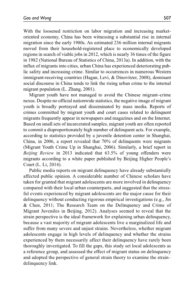 公共媒体对外来务工违法行为的报道已经严重影响了公众舆论。相当多的中国学者想当然地认为,与当地城市青少年相比,外来务工青少年的犯罪行为更为严重,并认为外来务工青少年所经历的应激事件是导致其犯罪的主要原因,而没有进行严格的实证调查(例如,金amp;陈,2011;2012年北京市外来务工违法犯罪问题研究小组)。分析似乎表明,压力观点是解释城市犯罪的理想框架,因为绝大多数移徙青少年都过着边缘化的生活,承受着许多严重和不公正的压力。然而,很少有人彻底调查外来务工青少年是否有高水平的犯罪行为以及他们所经历的压力是否必然影响他们的犯罪行为。为了填补这一空白,本研究以当地青少年为参照群体,评估外来务工身份对青少年犯罪的影响,并采用一般压力理论的视角来检验应变-犯罪之间的联系。