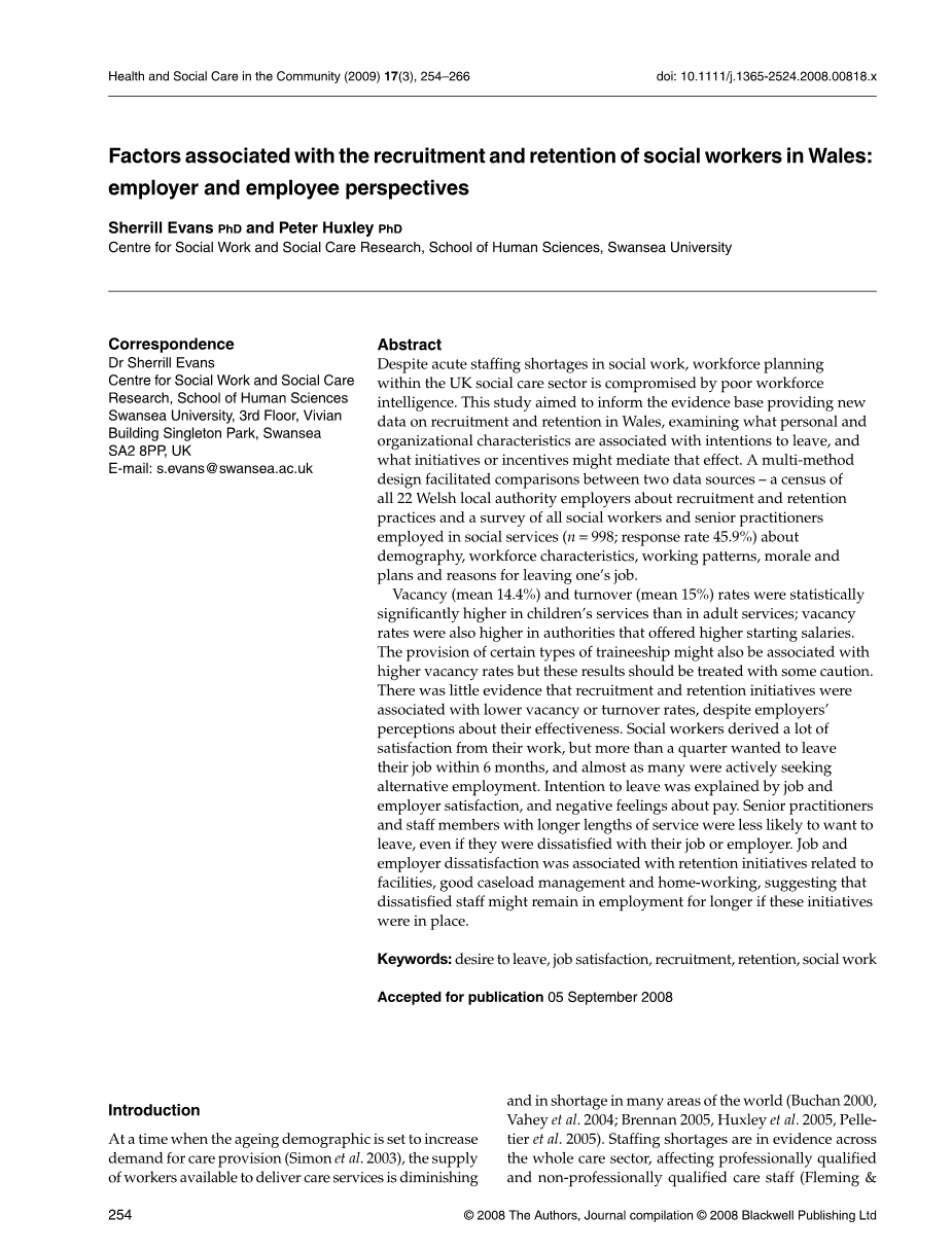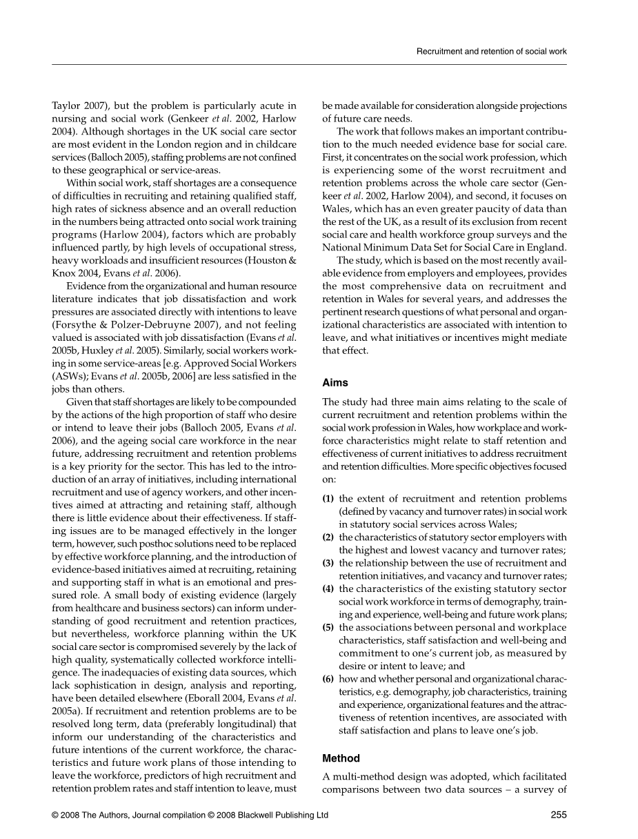 来自组织人力资源文献的证据表明,工作不满和工作压力与离职意图直接相关(Forsythamp;amp;Polzer Debruyne,2007年),而不受重视与工作不满有关(Evans等人,2005b,Huxley等人,2007年)。2005)。同样,社会工作者在某些服务领域工作,例如认证社会工作者对工作的满意度低于其他人。鉴于员工短缺可能会因希望或打算离职的员工比例较高而加剧(Balloch 2005,Evans等人,2006年),以及不久的将来将要老龄化的社会照护工作人员的行动而加剧。招聘和留用问题是该部门的一个重要优先事项,于是出台了一系列举措,包括国际招聘和使用机构工作人员,以及其他旨在吸引和留住工作人员的激励措施,尽管几乎没有证据表明这些措施的有效性。但是,如果要在长期内有效地管理人员问题,则需要用有效的劳动力规划来替代这种临时解决方案,并引入基于验证的举措,以招聘、留住和支持情绪化和媒体化的员工。角色扮演。一小部分现有的证据(主要来自医疗保健和商业部门)可以告诉人们良好的招聘和留用做法,但是,由于缺乏高质量、系统化的呼吁,英国社会护理部门的劳动力规划受到严重损害。Y收集了劳动力情报。现有数据源的不足之处(缺乏设计、分析和报告的复杂性)已在其他地方详细说明(Eball 2004,Evans等人,2005)。如果要长期解决招聘和留用问题,则需要提供数据(最好是纵向数据),以便我们了解当前劳动力的特征和未来意图、打算离开劳动力的人员的特征和未来工作计划,并预测高招聘率和留用率以及员工离职意愿的研究必须与未来护理需求的预测一起考虑。接下来的工作对急需的社会护理证据基础做出了重要贡献。首先,它集中在社会工作职业,在整个护理行业中正经历一些最严重的招聘和留用问题(Genkeer等人2002年,Harlow 2004年),第二,它关注的是威尔士,因为它被排除在最近的社会保健和卫生工作人员群体调查和英国社会保健的国家最低数据集之外,所以威尔士的数据比英国其他地方的数据更为缺乏。他最近从雇主和雇员那里获得了最有用的证据,提供了威尔士几年来最全面的招聘和留用数据,并解决了与意向有关的个人和组织特征的相关研究问题。离开,以及什么样的倡议或激励措施可能会调解这种影响。
