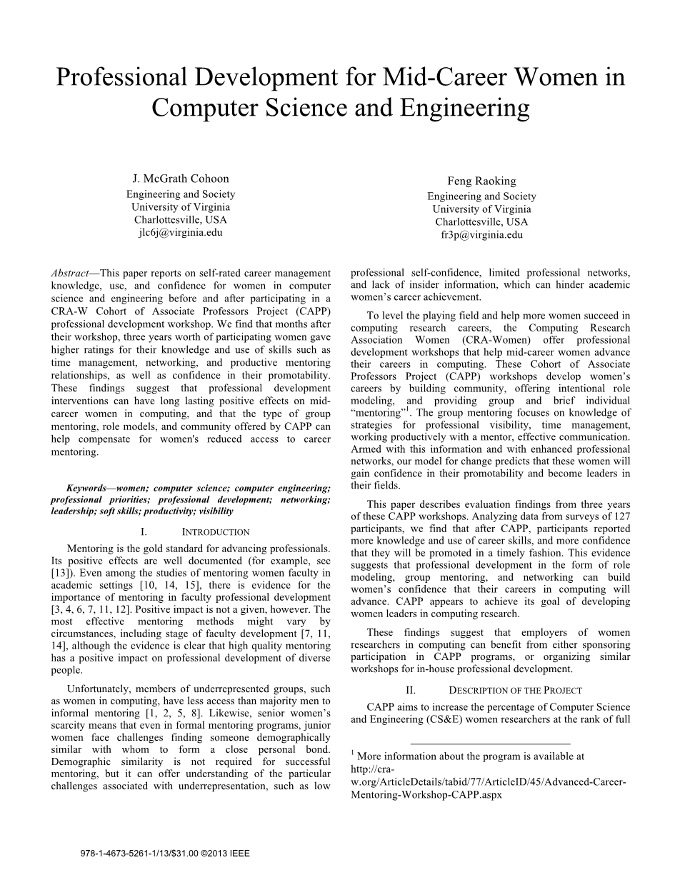 许多研究支持职业指导的有效性,角色模型和社区成员作为贡献者事业成功。 不幸的是,计算机中的女性比较少获得这些有益的条件比他们的男性同事。 为了弥补这种不平等,CRA-W CAPP研讨会旨在通过建设来发展女性的职业生涯社区,提供有意的角色建模和提供小组和简短的个人“指导”。 这篇报告调查这种方法是否成功。