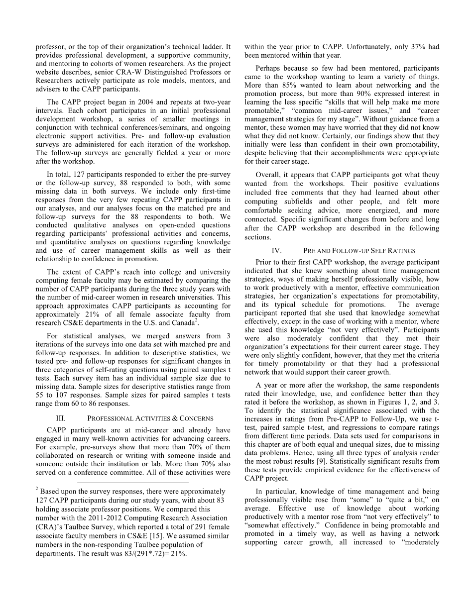 CAPP进入大学和计算机女教师的程度可以通过比较三个研究年度的CAPP参与者数量与研究型大学中职女性的数量来估算。 这种方法接近CAPP参与者,占美国和加拿大研究CS&E部门所有女性副教职员工的约21%