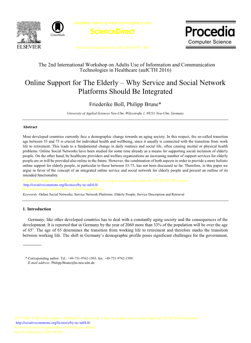 综上所述,在这篇意见书中,我们主张建立一个综合的在线服务和社交网络平台来支持老年人的日常生活,并描述了其预期的功能。通过结合网络服务描述的功能,检索和组合对医疗和健康与在线社交网络,这样一个平台将为老年人提供一个集成的网络环境,特别是帮助之间的桥梁专业和自愿的点对点服务。但是,拟议的概念仍然需要得到更详细的执行和评价。上述为老年人,特别是55岁至75岁之间的过渡时期的老年人,提出的这一平台的拟议好处也需要经验验证。因此,需要进一步的研究来实现这样一个平台的工作原型,并在实际场景中对其进行经验评估。