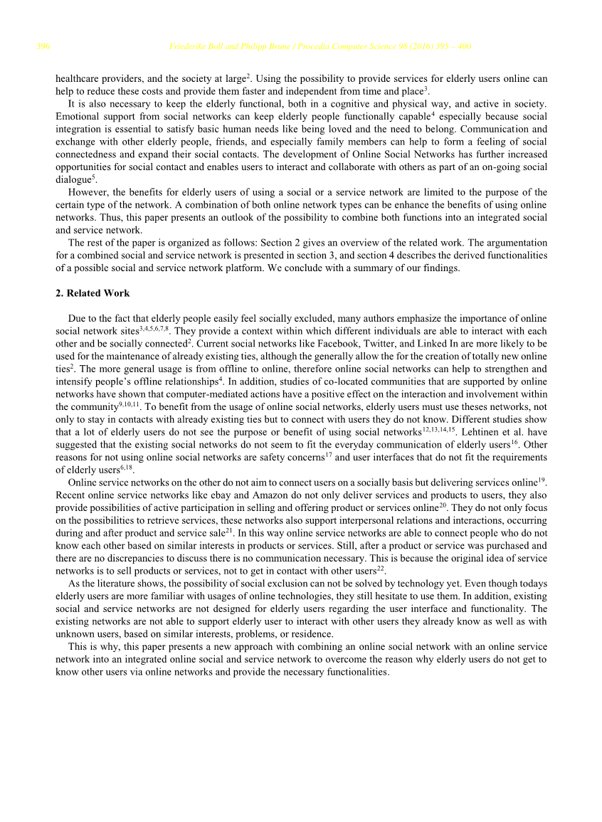 正如文献所示,技术还不能解决社会排斥的可能性。即使现在的老年用户更熟悉在线技术的使用,他们仍然不愿意使用它们。此外,现有的社交和服务网络在用户界面和功能方面都不是为老年用户设计的。现有的网络无法支持老年用户基于相似的兴趣、问题或居住地与他们已知的其他用户以及未知用户进行交互。