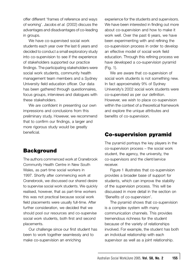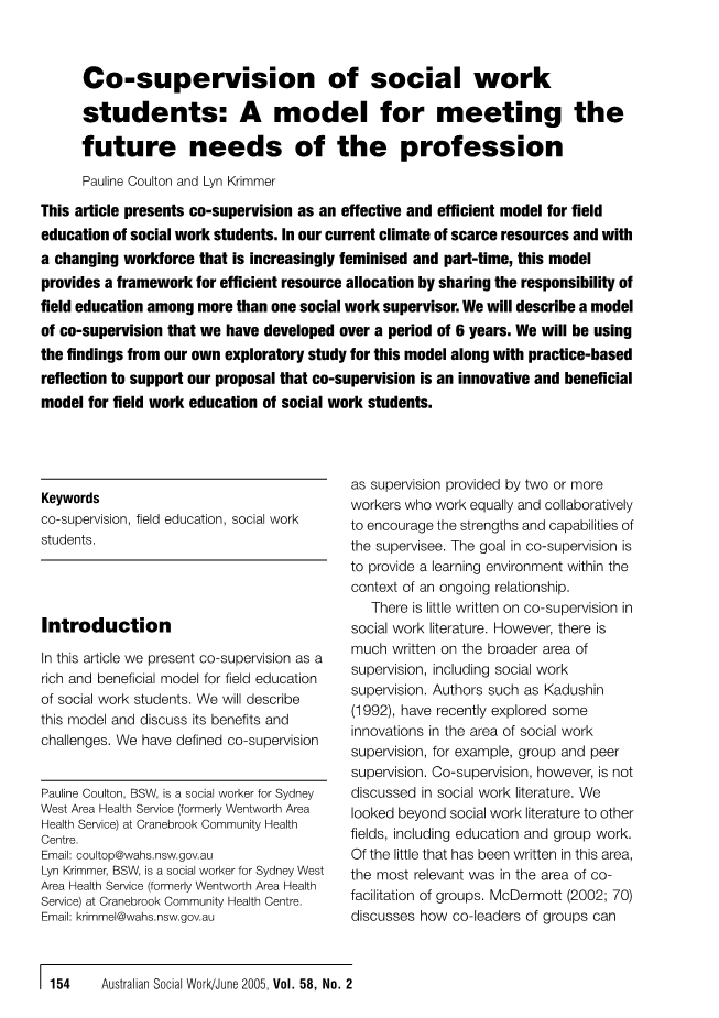 我们知道,社会工作学生的共同监督不是新鲜事。实际上,约有9%的悉尼大学2002年社会工作学生按照我们的定义进行了共同监督。
