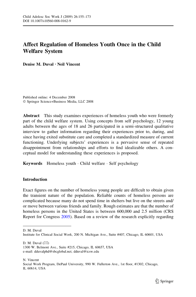 儿童福利制度虽然很少直接适用于年轻人,但自我心理学理论的主要思想也是相关的。没有已知的研究或论文来解决工作的概念,以加强青年的整体自我意识,作为发展生活技能,准备退出照料和过渡到独立的一部分。此外,很少有研究探讨了儿童虐待,替代护理安置,影响监管,无家可归和风险行为的概念。那些至少检查一些这些因素的人没有足够重视儿童未满足的心理需求与替代护理和情绪调节模式之间的潜在关联,而无家可归。鉴于研究发现,无家可归的青少年患有大量的急性和慢性情绪困扰,无家可归的人口中有大量以前的病房,试图更好地了解无家可归者前病房的自我心理结构的发展情况理论观点可能有助于更全面地了解当前这个人口问题的可能起源。