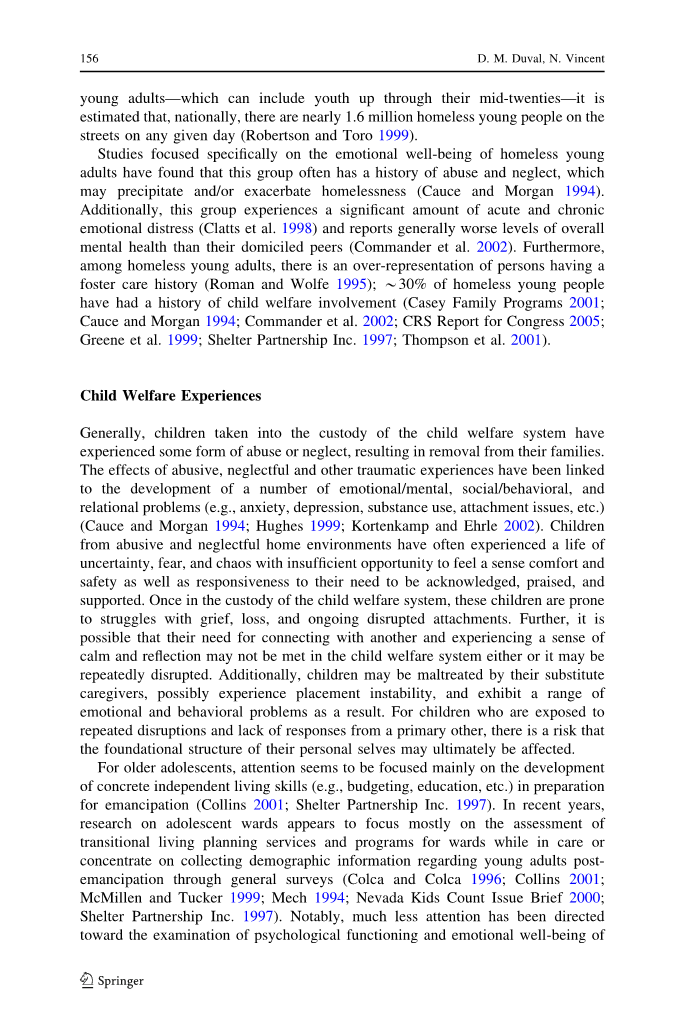 专门针对无家可归的青少年的情绪福祉的研究发现,这个群体经常有虐待和忽视的历史,这可能会渗透或加剧无家可归(Cauce and Morgan 1994)。此外,这个群体经历了大量的急性和慢性情绪困扰(Clatts et al.1998),并且报告了他们整体心理健康水平比同龄人更差(Commander et al.2002)。此外,在无家可归的年轻人中,拥有寄养历史的人数过多(Roman and Wolfe 1995); 30%的无家可归的年轻人有儿童福利参与的历史(Casey Family Programs 2001)。