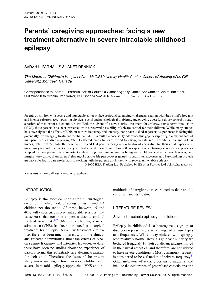 重症和难治性癫痫儿童的家长面临深刻的照顾挑战,来应对自己孩子的频繁和激烈发作伴随的生理,社会和心理问题,并通过不断追求多种药物治疗,饮食和手术来控制癫痫发作。随着新的,手术治疗的出现癫痫,迷走神经刺激(VNS),这些家长已经提出对子女控制癫痫发作的可能性更新。虽然许多研究调查了VNS对发作频率和强度的影响,但还没有调查父母的治疗经验在对孩子的潜在生命危险治疗方面的改变。这些案例通过研究9个犯有迷走神经的子女父母的经验的探索解决了这个差距。收集了超过6个月时间跟随孩子父母在医院,诊所,并在其家园,从22个数据进行了深入采访发现,面对他们的孩子的一个新的治疗选择。父母经历了四处求医的不确定性,有必要对他们的期望施加控制。在儿童患有慢性疾病的佳通被父母普遍接受使用的持续的照料方法与现有文献是一致的,但是新的方法是从父母的交流他们得到的积极的生活观念的经验中得到。这些发现在严重,难治性癫痫工作中提供给了专业医护人员与患儿家长指导。