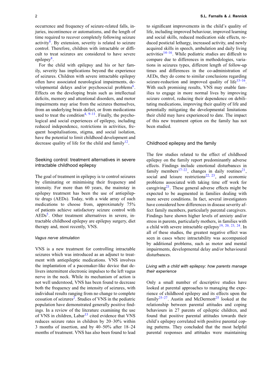 VNS是治疗顽固性癫痫发作的新治疗方法,作为治疗抗癫痫药物的辅助剂。 VNS涉及植入起搏器的装置,其将断续的电子脉冲除去颈部的左迷走神经。虽然其作用机制尚未得到充分的了解,但已经发现VNS降低了癫痫发作的频率和强度,个体结果从不改变到完全停止癫痫发作。儿科人群中VNS的研究已经显示出普遍的阳性发现。 Labar13在对使用VNS进行儿童检查的文献进行回顾时,引用了VNS在插入3个月内将儿童癫痫发作率降低20-30%的证据,18-24个月治疗后,窒息率降低了40-50%。 VNS也被发现导致了儿童生活质量的显著改善,包括改善行为,提高学习和社交技能,减少药物副作用,重新产生后期嗜睡,活动增加以及新获得的言语,行动和日常生活活动。虽然儿科研究难以比较,因为方法学的差异,癫痫发作类型的变化,随访时间的长度不同以及AED的共同管理的差异,但他们对于减少癫痫发作和改善质量也有类似的结论的生活。通过这些有希望的结果,VNS可以通过改善癫痫发作控制,减少他们对减免药物的依赖,提高他们的生活质量和潜在地减轻他们的孩子迄今为止可能遇到的发展限制,使家庭能够参与更多的正常生活。这种新的治疗方案对家庭的影响尚未得到研究。