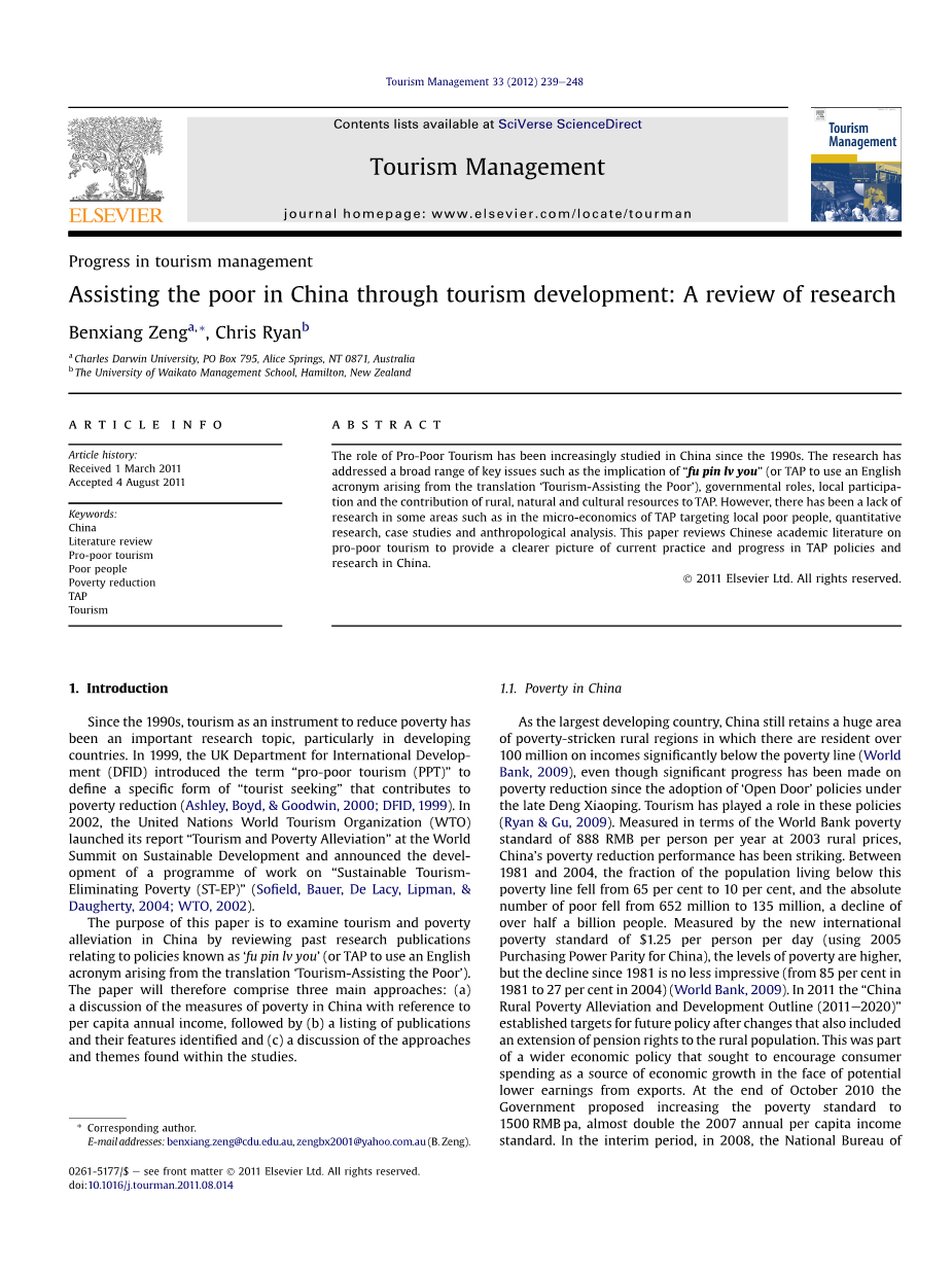 曾本祥,克里斯·瑞恩摘要:九十年代以来,扶贫旅游在中国的作用日益加深。 研究涉及一系列的关键问题,如“旅游扶贫”的含义(TAP一个英语近义词-源于旅游扶贫的中文翻译)、政府角色、地方参与和农村、 自然和人文资源在扶贫上的贡献。 然而,在某些领域缺乏研究,例如微观经济学的TAP针对当地贫困人口、定量研究、案例研究和人类学分析。本文回顾了中国旅游扶贫的学术文献,提供了一个更清晰的图像,展现出目前在中国TAP政策和研究中的实践与进展情况。