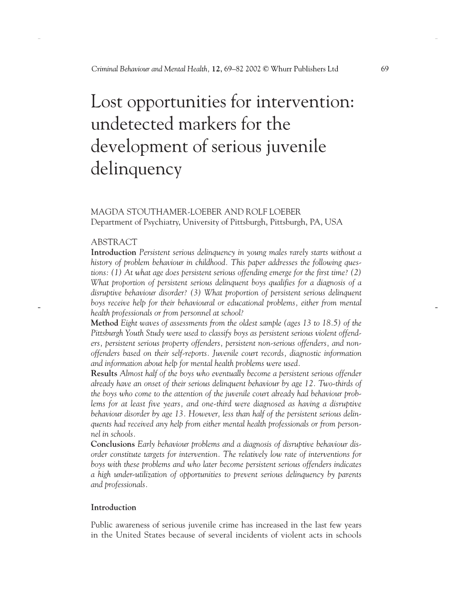 简介:在年轻男性严重的持续性犯罪案例中,很少有人在儿童期间没有问题行为的历史。本文讨论了以下问题:(1)在什么年龄发生的第一次持久的严重犯罪? (2)有多大比例持续严重的少罪犯会被诊断为破坏性行为障碍? (3)是什么因素影响孩子们得不到帮助为他们的行为或教育问题,无论是从精神卫生专业人员或从学校工作人员的角度来说?