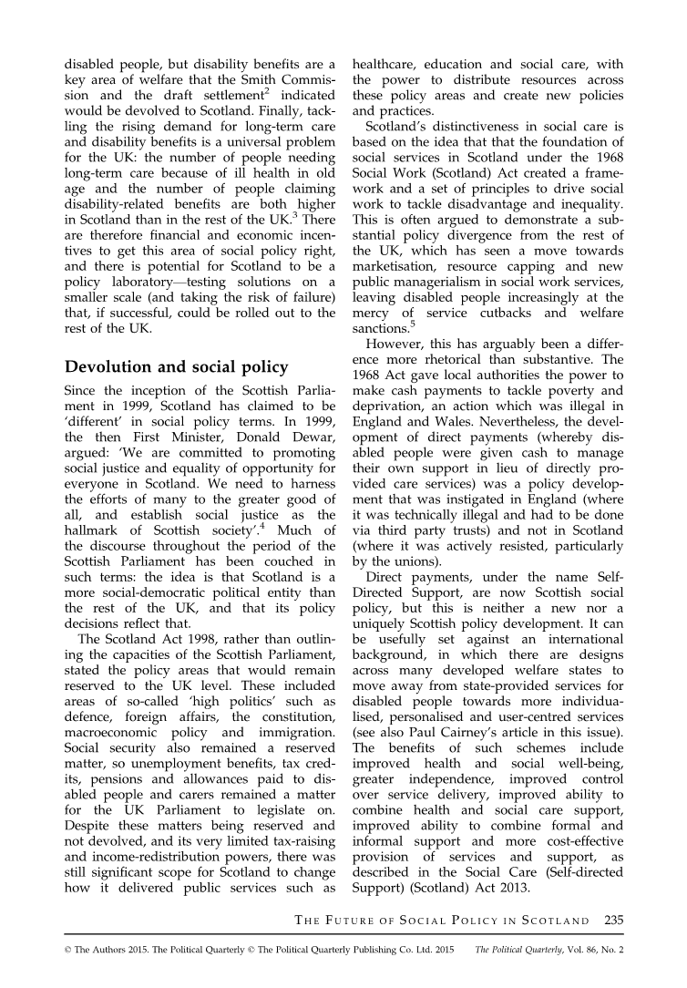 最后,长期护理需求上升和残疾人伤残津贴是英国一个很普遍的需要解决的问题:由于疾病和老龄化,与英国其他地区相比,苏格兰有很大数量的人都需要长期照顾服务,而且对于残疾相关的社会福利政策的需求也很高。因此也需要经济和金融方面提供支持,来激励获得这方面的社会政策权力,苏格兰是有潜力成为一个政策的实验基地,在一个小的范围里进行试验,同时也考虑到失败的风险,如果成功了,那么就可以在英国其他地方进行推广。自1999年苏格兰议会成立以来,苏格兰就声称在社会政策方面和其他地区是不一样的。在1999年,当时的第一部长唐纳德·杜瓦,在会议上强调道:“在苏格兰,我们致力于为大家创造社会社会公正和机会均等化的社会氛围。因此我们需要更加的努力来获得更大的利益,树立社会公正来作为苏格兰的标志。”在整个苏格兰会议期间所产生的很多条款都旨在阐明一个观点,这个观点就是,苏格兰会比英国其他地区实行更加民主的社会政治政策,是一个更加民主的政治实体,所有的决策都会体现出这一点。在 1998年苏格兰法案中,与其说是表明了苏格兰议会的能力,倒不如说是将政策领域的决策权力保留给了英国层面。其中包括所谓的“高层政治”,如国防、外交、宪法、宏观经济政策和移民政策领域。社会保障方面也仍然保留了一些问题,因此失业救济金、税收减免、养老金和支付给残疾人士和照顾着津贴仍然是要在英国议会上面进行立法的问题。而不是概述了苏格兰议会的能力,表示将保持政策领域。尽管这些问题被保留给了英国层面,而不是权力下放给苏格兰议会,但是苏格兰议会依然会运用它非常有限的提高税收和收入再分配的权利,来改变本土如何更好地提供社会公共服务,比如医疗、教育和社会关怀,在权力范围之类去重新分配这些政策领域的资源,从而创造出新的政策和做法。在苏格兰大力倡导社会服务的背景下,1968年苏格兰社会工作法令创建了一个框架和一系列原则,苏格兰社会关怀的独特性就是建立在这个的基础之上,以推动社会共同应对劣势和不平等的想法。这通常被认为是苏格兰和英国其他地区的政策分歧所在,并且已经看到它朝着市场化,资源上限和新公共管理主义的社会工作服务方向前进,是残疾人越来越受服务削减和福利制裁的控制。 然而,这可以说是相差不是实质性更多的修辞。1968年法案给了当地直接支配财政资金的权利,用来解决社会贫困问题,这种权利在英格兰和威尔士是属于非法的。 然而,直接支配的发展(即给予残疾人现金代替直接提供医疗服务让他们自己管理自己)在英国的政策制定上来说是非法的(教唆它在技术上是非法的,必须通过第三方进行信托),而不是在苏格兰(它被极力抗拒,特别是工会)。直接支付,意属于自我直接支持,现在是苏格兰实行的社会政策,但是这既不是新的,也不是唯一一个由苏格兰指定的社会政策。它可以被有效地坚决的拿来反对国际背景,其中有许多发达的福利国家的设计,从为残疾人国家提供的服务向更加个人化,个性化和用户为中心的服务(见保罗Cairney在这个问题上的文章)方向迈进。 这种方案的好处包括改善卫生和社会福利,拥有更大的独立性,可以控制提供服务的改进,卫生和社会关怀支持相结合的能力提高,结合了正式和非正式的支持和服务,使之更具有有成本效益。在2013年关于社会关怀的描述法令中,包括2003年的社区护理和健康法案,在社会关怀的描述该法案认为当局有义务提供代替标准的社区直接支付最新保健服务。地方权力机构把支付安排给了个人(或代表),这对于他们来说被评定为一种需要,这对于一些用户提高了选择和控制,他们可以行使他们的服务业务。 苏格兰地方权力机构(在英格兰和威尔士地方当局线)有责任为符合条件的人提供直接支付。 第一个有资格的非残疾用户群来自2005年4月:被评定为有社会关怀需求或者养老服务的残疾儿童和老年人。根据2013年的法案,苏格兰的所有地方政府部门都可以提供用户自己所选择的服务,他们可以选择多种形式,包括直接支付。用户仍然需要进行一个评估,看看他们有哪些服务可以满足需求。 然后,在机构和个人层面,这种政策已在英国各地的差异很大:有些地区在英国卷取率一倍以上,在英国的一些独立地方政府(如新罕布什尔州)已经注册的用户数超过了整个苏格兰。 据苏格兰政府公布的数据,直接支付卷取率仍然远远高于在苏格兰高于整个英国。直接支付的一些障碍包括对一线工人和管理人员的组成部分,需要投入的宣传和支持机构,以帮助用户管理他们的付款,以及表达的关切缺乏认识所涉及弱势用户和社会关怀的阻力的风险。 那里已经直接支付的显著摄取方面仔细分析表明,这些领域显示出强劲的残疾导致用户组织的历史(和通过第三方信托准法律直接付款的历史,例如)和/或市场社会保健提供发展的政治承诺。 强劲的用户需求和社会对男女的市场在社会关怀已推动直接支付和相关的方案(如个人预算),似乎是在苏格兰不太普遍的发展的政策举措的双推动作用,虽然根据苏格兰政府公布的数据,由当地政府负责的家庭照顾从2000年的82%下降到44%,2011年提供,直接支付的苏格兰用户在英国其他地方的用户报告类似的改进结果。然而,要嵌入式的再苏格兰实现直接支付的制度性障碍还是难以解决,包括对