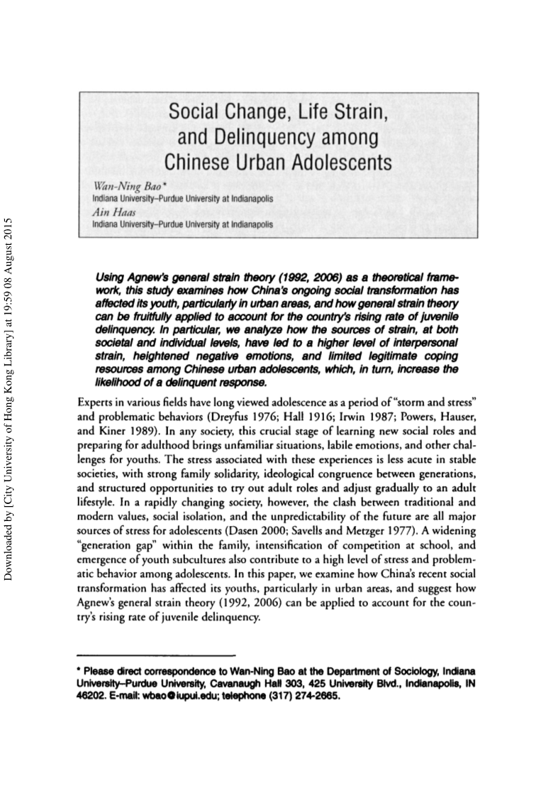 长期以来各个领域的专家们一直认为青少年时期是“风暴和压力和问题行为(德莱弗斯1976;霍尔1916;欧文1987;鲍尔斯,春诺1989)。在任何一个社会中,学习新的社会角色和为成年所带来的不熟悉的情况、不稳定的情绪和年轻人会面临的挑战做准备是一个很重要的阶段。在稳定的社会中,尝试成人角色,并逐渐调整适应成熟的生活方式所带来的压力不是很有危险性的,这些压力包括非常团结的家庭、世代之间思想的一致性以及结构化的机会。然而,在一个迅速变化的社会,传统与现代价值观、社会隔离的冲突和未来的不可预测性是青少年的主要压力源(戴森2000;萨文和梅夫斯 1977)。不断扩大的“代沟”在家里,在学校的竞争加剧,与青年亚文化的出现也有助于青少年的高应力水平和问题行为。在本文中,我们考察中国近年来的社会转型影响了中国年轻人,特别是在城市地区,并提出可以将阿格纽的一般紧张理论(1992,2006)应用于不断增长的城市青少年犯罪。
