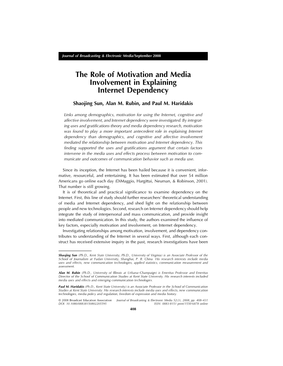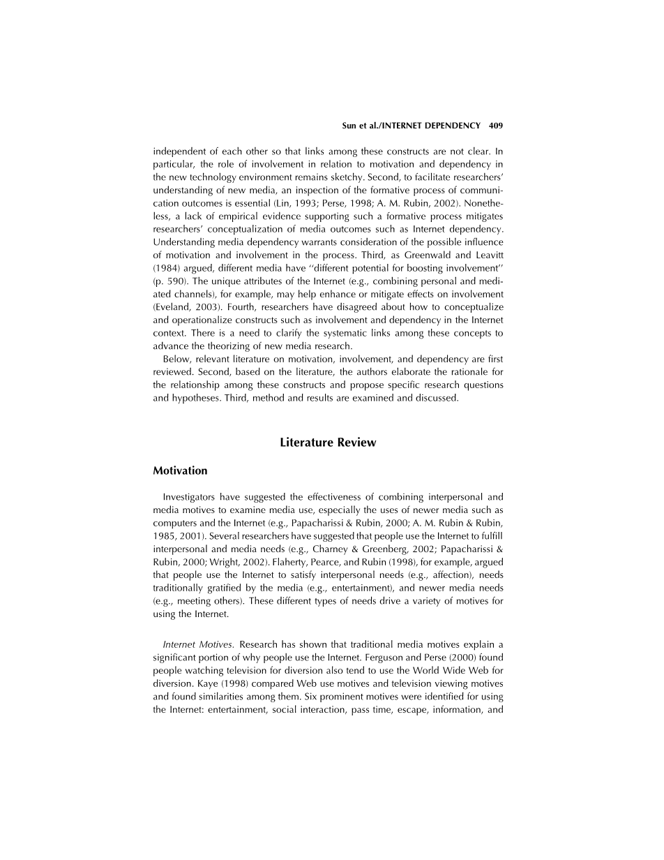 调查关于动机、参与和依赖的关系,有助于理解互联网的几种方式。首先,虽然每一个结构都得到了广泛的调查,但研究调查一直是相互独立的,所以这些结构之间的联系不清楚。特别是涉及到参与和依赖作用在新技术环境下仍然是粗略的。第二,为了方便研究人员增强对新媒体的认识,对沟通结果的形成过程的考察是必不可少的(Lin, 1993; Perse, 1998; A. M. Rubin, 2002)。然而,缺乏实证证据支持这样一个形成过程减少了研究人员对媒体结果的概念化,比如网络依赖。理解媒介依赖保证了影参与和动机在过程中可能的影响的考虑。第三、Greenwald和Leavitt(1984)认为,不同的媒介有“不同的促进参与的潜能”rsquo;(p. 590)。举例来说,互联网的独特属性(例如,结合个人和媒介的渠道)可能有助于增强或减轻对参与的影响(Eveland, 2003)。第四,研究人员对怎样概念化和实施参与和依赖的互联网语境有不同的观点。有必要澄清这些概念之间的系统联系推进理论对新媒体的研究。