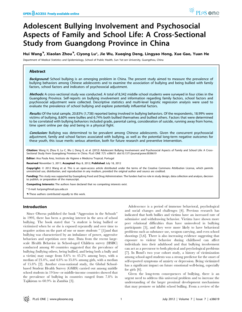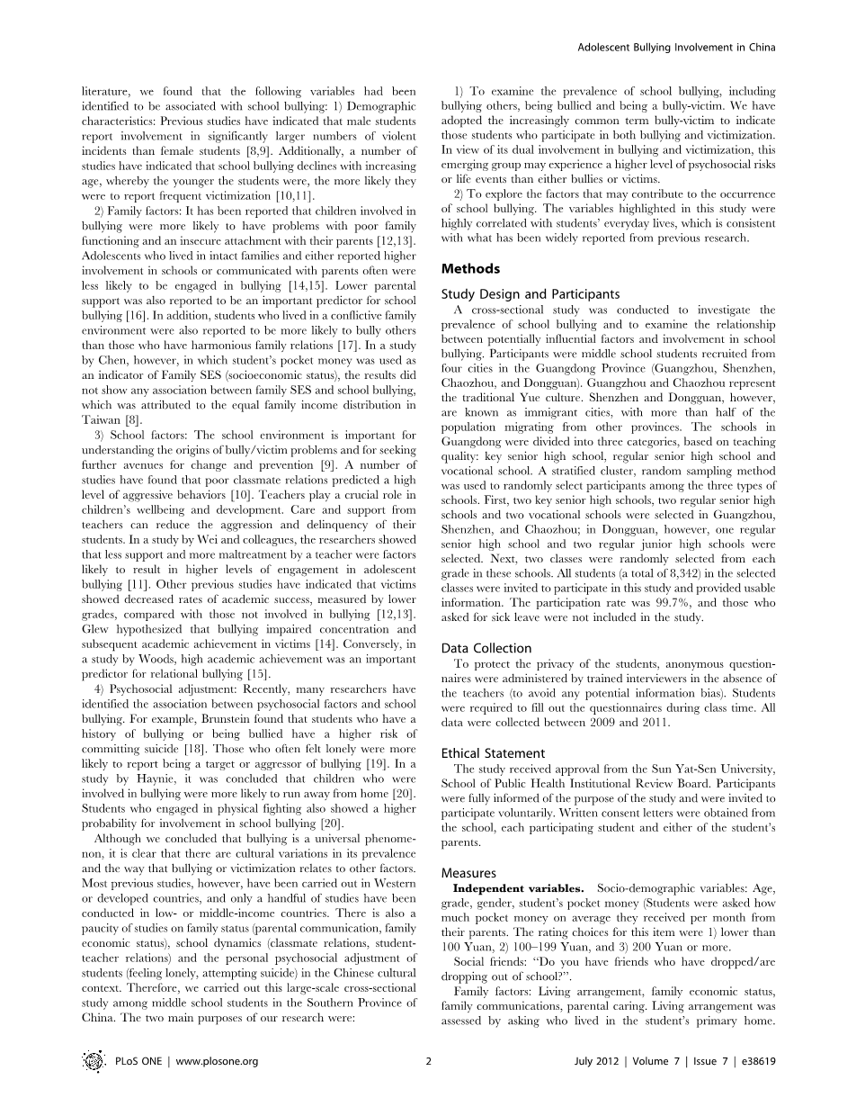 虽然我们总结得出校园欺凌是一个普遍的现象,但是显而易见安,在其发生的普遍性中还是有文化差异存在的,并且这与其他因素也是有关联的。众多先前的研究结论都来自在西方或者是发达国家,只有很少一部分来自低收入或者中等收入国家。同样关于家庭地位(父母交流、家庭经济状况)的,学校的动态因素(同学关系、学生与老师的关系)的和个人对学生身份的适应能力(感到孤单、尝试自杀)方面在中国文化板块中的研究都十分缺乏。因此,我们在中国南方省市初中中进行了了大范围的具有代表性的研究。我们研究的两个主要目的是:1)测试校园欺凌(包括欺凌他人、被欺凌双方)的普遍性,我们采用了越来越普遍的词欺受双方来表示卷入欺凌行为的双方学生。鉴于欺凌者和被欺凌者的双重介入,这个新兴群体可能会遭遇更高程度的心理风险和生活事件,相对于欺凌者或者被欺凌者单方而言。2)去发掘更多导致校园欺凌行为的因素。在这项研究中最突出的变量是与学生日常生活高度相关的。这些变量包括之前研究所广泛探讨的。