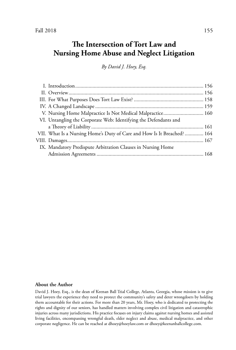 当养老院被追究居住者虐待和忽视的责任时,这些目标就实现了。涉及疗养院居民的悲剧事件往往是一种有意识的商业决策的结果,一种长期削减成本的权衡。直到最近,侵权法还没有有效地用来影响技术熟练的护理机构的商业模式的变化,而且由于各种原因,原告律师在养老院的情况下很大程度上回避了伤害诉讼。但是,对养老院及其企业父母做出充分的判决,尤其是那些对原告作出惩罚性赔偿的判决,会让经营者知道公众不会容忍社区中对老年人和残疾人的忽视和虐待,从而提高法律和监管的有效性。为每一位受害者进行宣传,对于保护我国老年人的生活质量,确保他们现在和将来都享有应有的尊严至关重要。