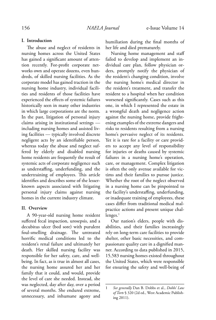 养老院的管理和工作人员没有制定和实施个人护理计划,没有遵照医嘱,没有及时通知医生住院病人的病情变化,没有让养老院的医务主任参与住院病人的治疗,没有在住院病人病情严重恶化时将其转院。在这类案例中,我代表地产公司对养老院提起了非正常死亡和疏忽的诉讼。这些案例提供了一些可怕的例子,说明养老院普遍忽视居民会给居民带来极端危险和风险。然而,对于养老院的运营、护理或管理方面的系统性失误所导致的伤害或死亡,机构或护理提供者很少承担任何程度的责任。复杂的诉讼往往是受害者及其家属寻求正义的唯一途径。不管在疗养院中观察到的忽视的根源是否可以确定为该设施的人员不足、资金不足或员工培训不足,这些案例不同于传统的医疗事故行为,并提出了独特的挑战。