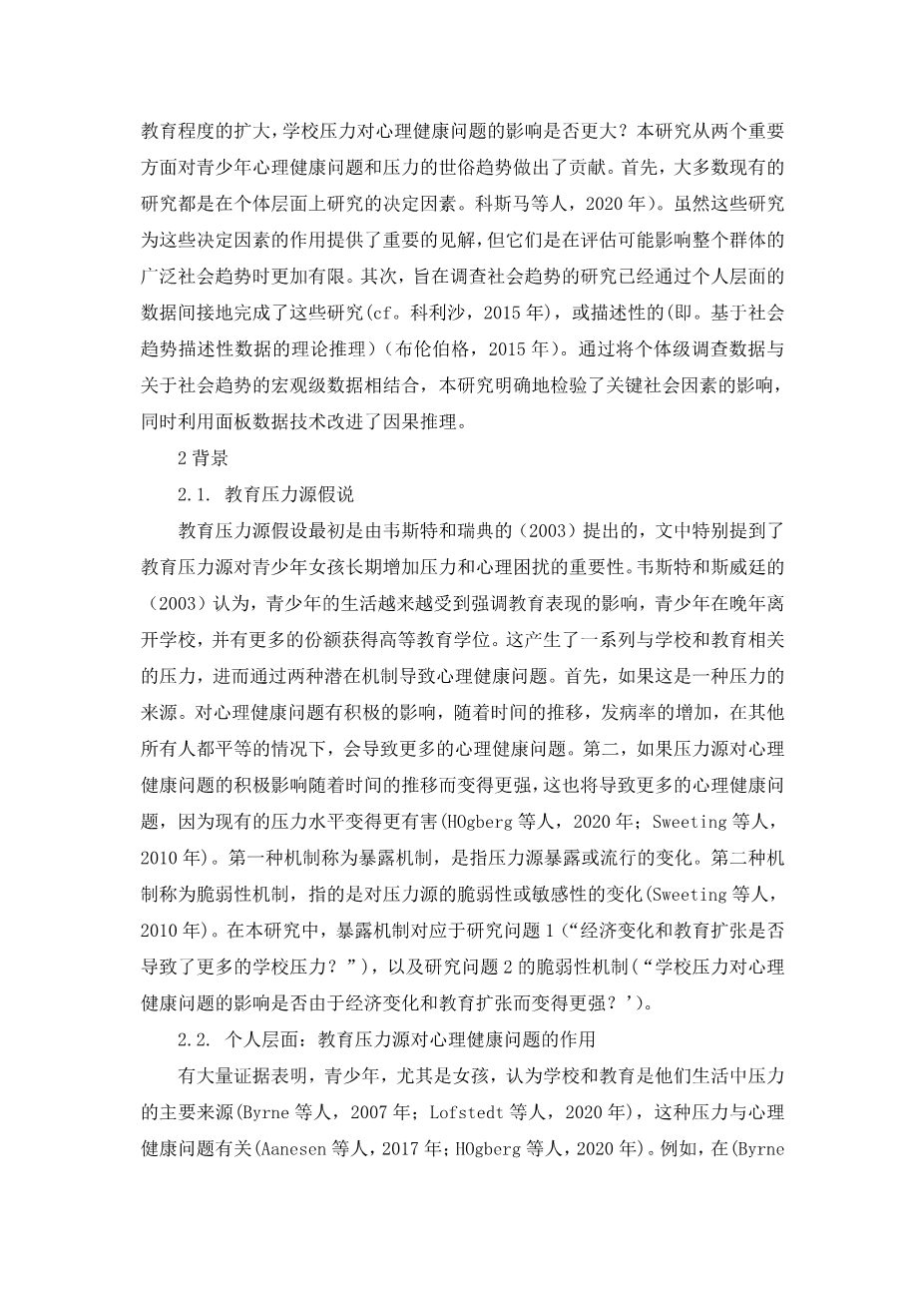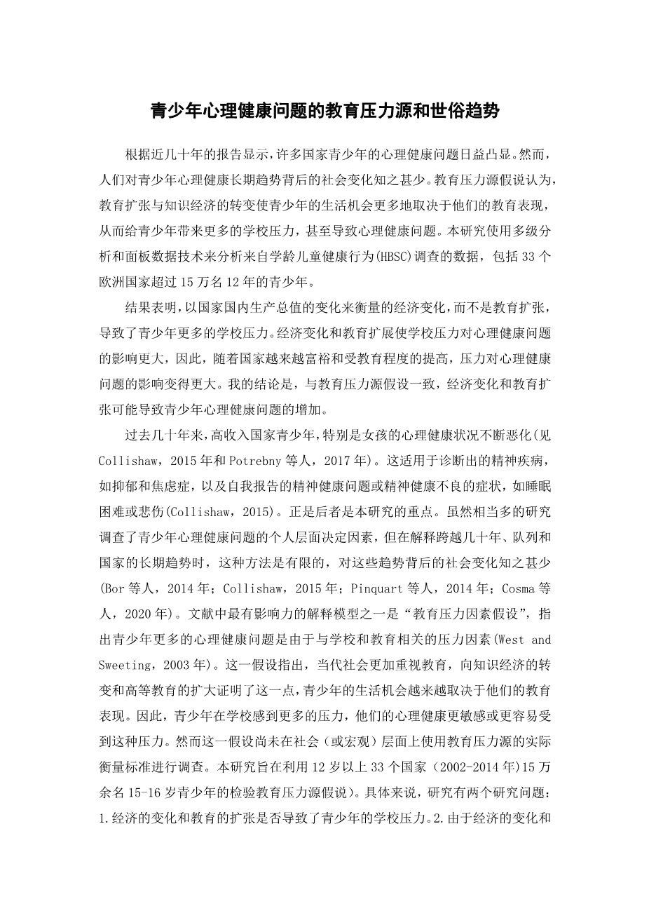 青少年心理健康问题的教育压力源和世俗趋势外文翻译资料 2022-08-02 15:33:23 英语原文共 9 页,剩余内容已隐藏,支付完成后下载完整资料 英语译文共 6 页,剩余内容已隐藏,支付完成后下载完整资料 资料编号:[267104],资料为PDF文档或Word文档,PDF文档可免费转换为Word 原文和译文剩余内容已隐藏,您需要先支付 30元 才能查看原文和译文全部内容!立即支付 发小红书推广免费获取该资料资格。点击链接进入获取推广文案即可: Ai一键组稿 | 降AI率 | 降重复率 | 论文一键排版 PREVIOUS NEXT 您可能感兴趣的文章 云南大理州农村养老保障体系与白族土地使用权流转——以中国剑川县为例外文翻译资料 影响公众对城市家庭医生计划不满的因素:法尔斯省一项基于一般群的研究外文翻译资料 中国的长期护理保险政策试验:对准入的影响外文翻译资料 中国医疗服务供给侧“看病难”的供需原因分析外文翻译资料 印度农村老年保健的老年人健康信息技术框架:一项政策倡议外文翻译资料 慈善众筹的社会筹款机制外文翻译资料 采用农业保险的决定因素:来自巴西圣保罗州农民的证据外文翻译资料 社区护理的现状及对策研究外文翻译资料 新加坡:社会发展,住房和中央公积金基金外文翻译资料 美利坚合众国的关爱老社区和社会包容外文翻译资料