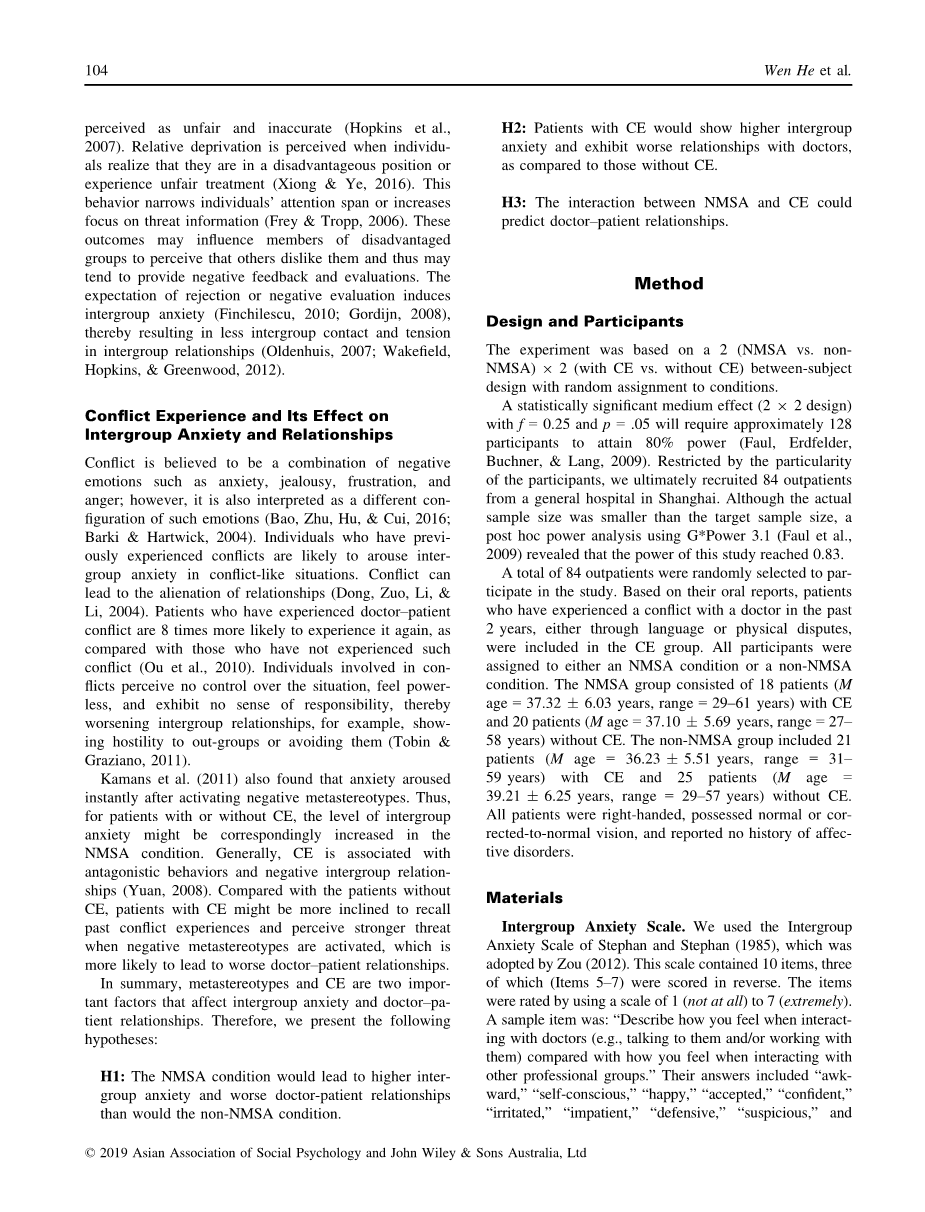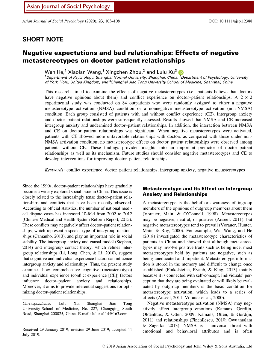 亚型对人群间焦虑和医生-患者关系的影响与先前的研究(Andrighetto, Durante,Lugani,Volpato,amp;Mirisola,2013;Luksyte,Waite,Avery,amp;Roy,2013)。该观察结果可能归因于元定型激活,导致人们负面评价自己,从而增加他们的自卑感,降低他们的自尊心,最后导致焦虑(Ajzen&Fishbein,2005)。 在负面方面元定型,结果证实了我们的假设NMSA直接影响了医患关系因为它影响了个人的人际判断,期望和联系经历,从而影响他们对外群体(Shelton&Richeson,2005)。