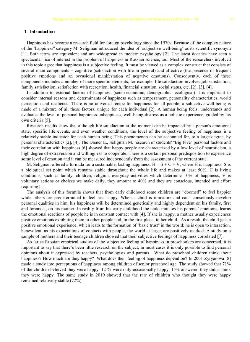 研究表明,与有时感到不快乐的孩子相比,感到快乐的孩子表现出较低的焦虑水平和内向水平。5-6岁儿童的样本组证明了Diener E.,Seligman M.提供的数据,描述快乐的人神经质水平低,外向性高。因此,主观幸福感水平在一定程度上取决于许多稳定的个人个性特征。尚未证明关于快乐的孩子之间更高程度的合作意愿的假设。对于大多数参与者而言,该参数的数字都不够高。 这可能是由于5-6岁儿童的沟通技巧发展水平低所致。