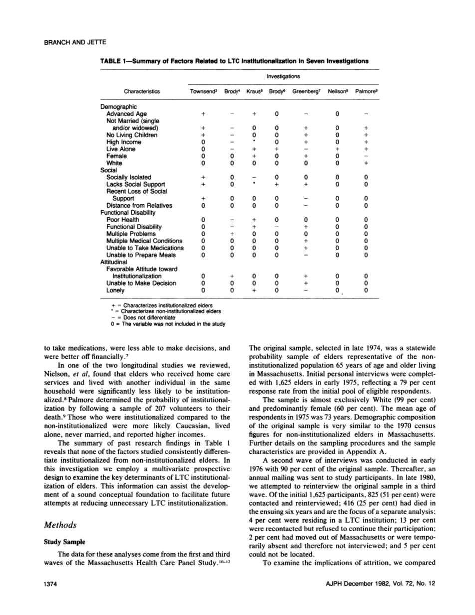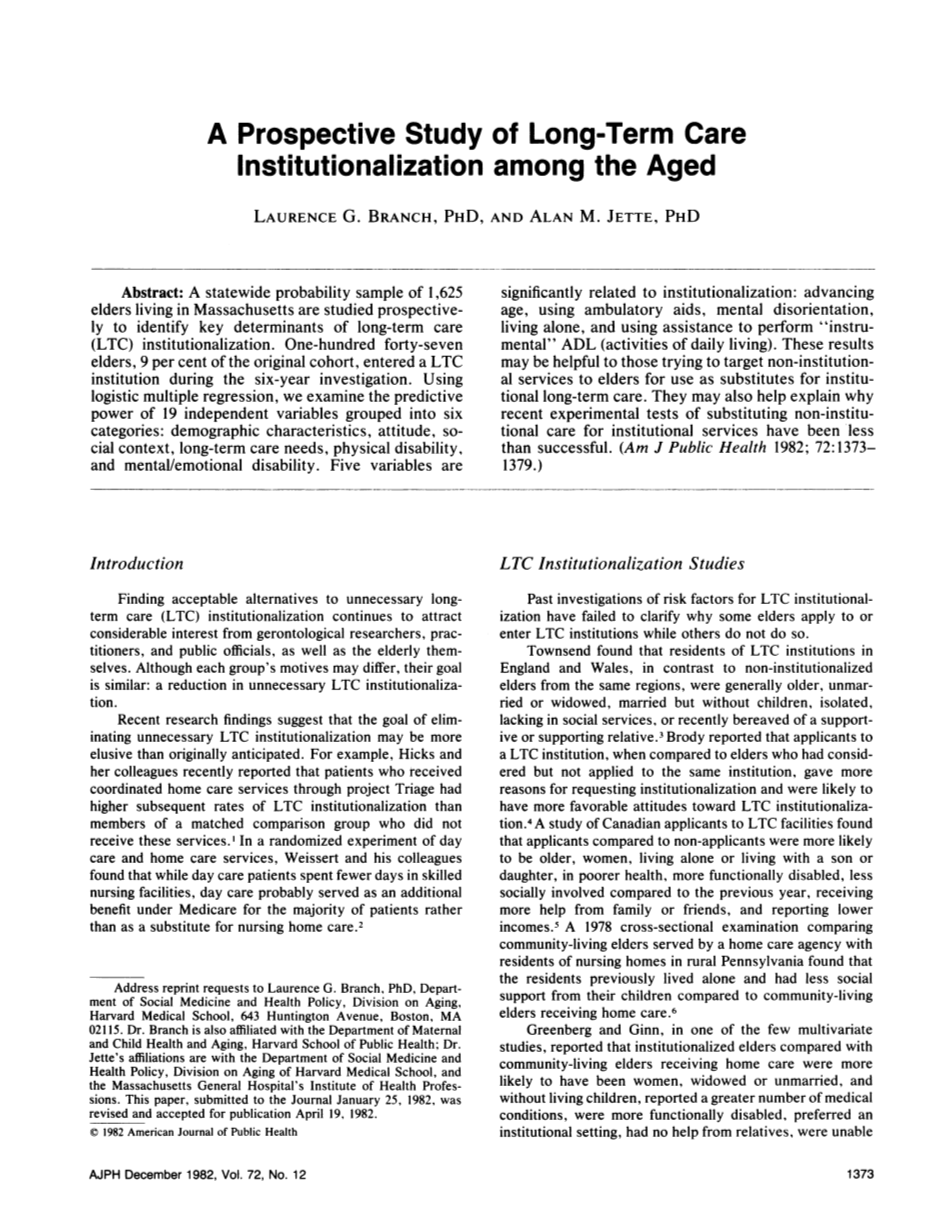 在我们审查的两项纵向研究之一中,尼尔森(Nielson)等人发现,获得家庭护理服务并与同一个家庭中的另一人同住的长者被制度化的可能性大大降低。8 Palmore通过对207名志愿者死亡的样本进行跟踪,确定了机构化的可能性。9与那些没有制度化的人相比,制度化的人更有可能是白种人,一个人住,从未结婚,收入更高。