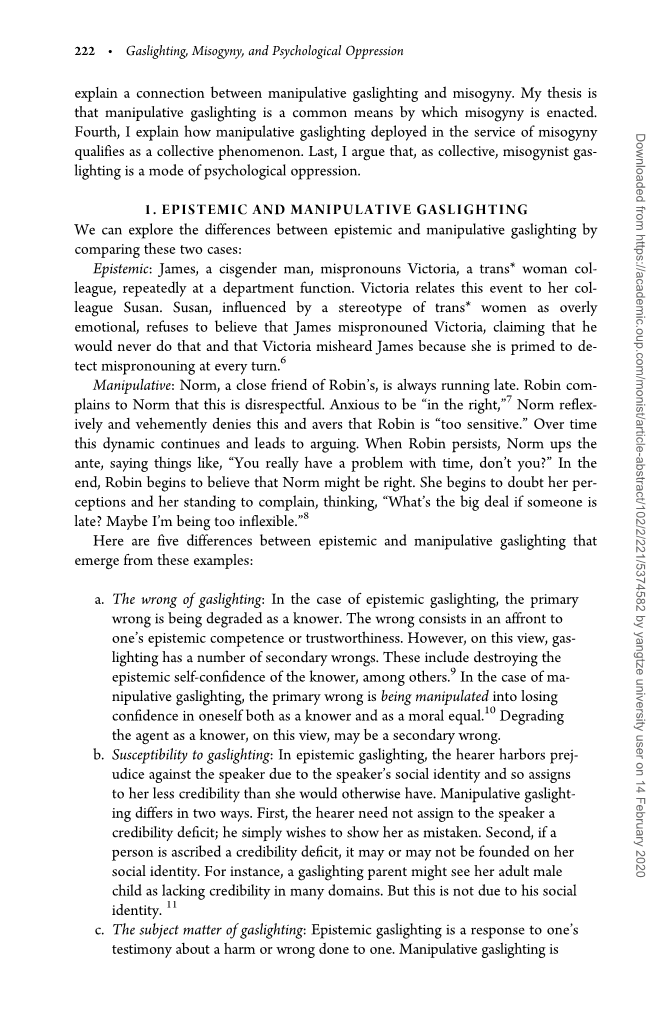 在下文中,我提出了一种操纵性煤气灯效应的概念,我认为这是捕捉没有被认知煤气灯效应所解释的社会现象所必需的,该现象是系统地否认妇女对男人对她们的伤害的作证,即我的目标是讨论所谓的“证词政治”的一个特征,而这并不是针对流行主义的轻描淡写的目的。我的论据结构如下。首先,我概述认知煤气灯效应与操纵煤气灯效应之间存在一些差异。鉴于此,我解释了为什么认知煤气灯效应无法捕捉到刚刚描述的现象。其次,我提供了一个关于操纵煤气灯效应的说明,使我能够将其与(仅仅是)合理的分歧区分开来。第三,我解释了操纵性煤气灯效应与厌女症之间的联系。我的论文是操纵性煤气灯效应是实施厌女症的一种常见手段。为厌食症而使用的轻度气化煤气灯效应被认为是一种集体现象。最后,我认为,作为厌恶症的集体煤气灯效应,厌恶女性的煤气灯效应是一种心理压迫的方式。