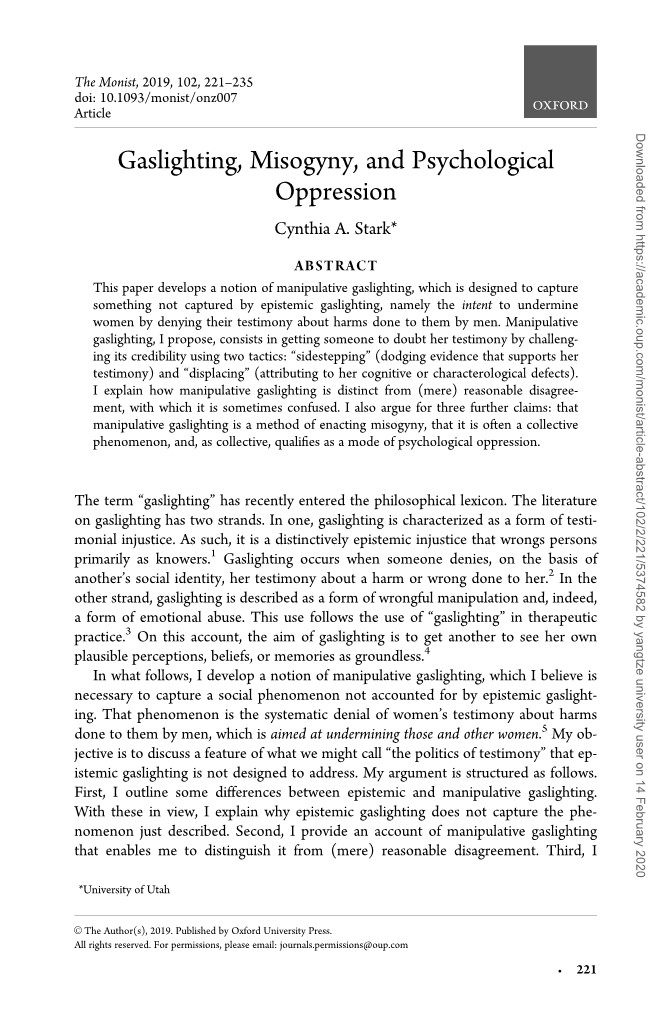 本文提出了操纵式煤气灯效应的概念,旨在捕捉认知式煤气灯效应没有捕捉到的东西,即通过否认女性关于男性对其造成伤害的证词来削弱女性的意图。我认为,操纵性的煤气灯效应包括通过质疑她的证词的可信度来让某人怀疑她的证词,这种质疑使用了两种策略:“回避”(回避支持她的证词的证据)和“转移”(归因于她的认知或性格缺陷)。我解释了操纵式煤气灯是如何区别于(仅仅)合理的反对意见的,这种意见有时会被混淆。我还支持三个进一步的主张:操纵式煤气灯是一种表现厌女症的方法,它通常是一种集体现象,作为集体,被称为一种心理压迫模式。