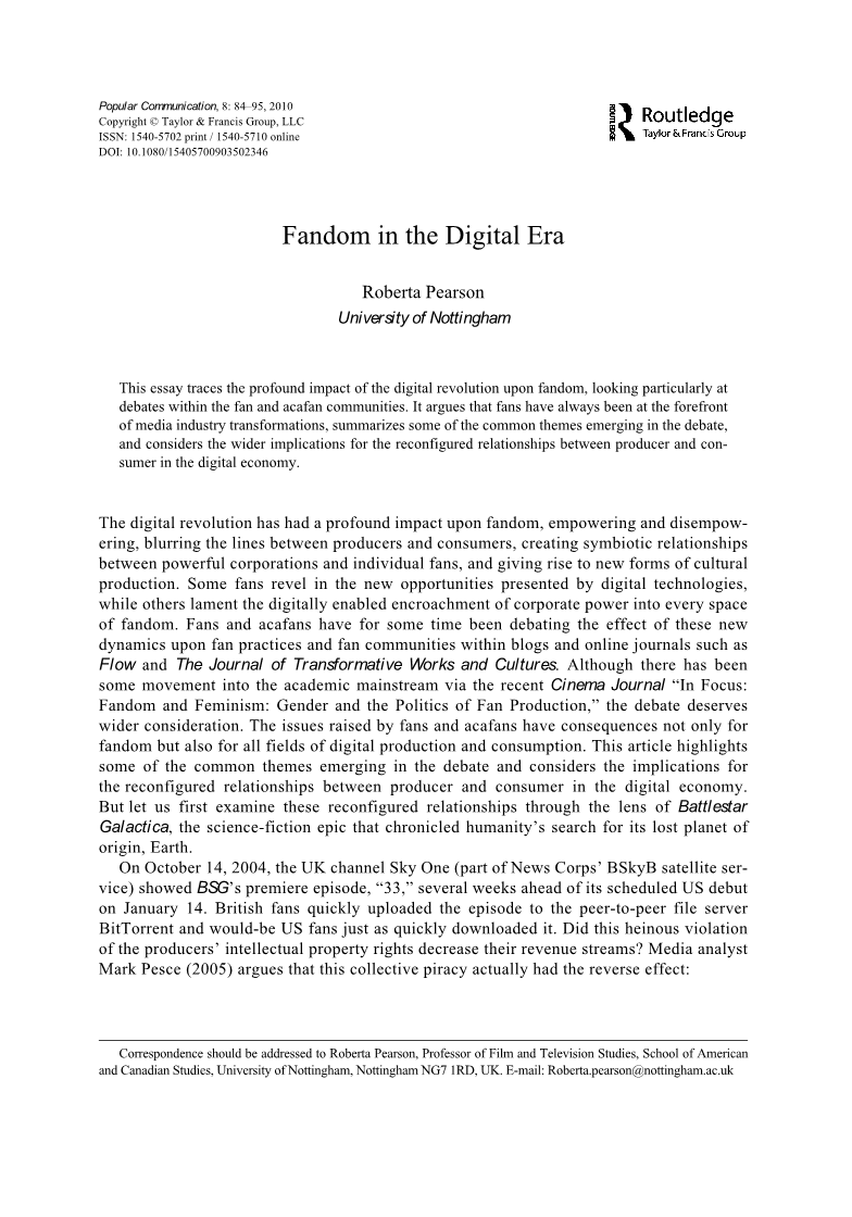 数字革命对粉丝站产生了深远的影响,赋予和剥夺了其权力,模糊了生产者和消费者之间的界限,在强大的企业和个体粉丝之间建立了共生关系,并产生了新的文化生产形式。一些粉丝为数字技术带来的新机遇而欣喜若狂,而另一些粉丝则哀叹数字技术使企业权力侵占了粉丝站的每一寸空间。一段时间以来,粉丝和acafans一直在讨论这些新动态对博客和在线期刊(如《Flow》和《变革作品与文化期刊》)中粉丝实践和粉丝社区的影响。虽然借助于最近的电影杂志《聚焦:粉丝站与女权主义:性别与粉丝生产的政治》已经有一些进入学术主流的运动,但这场争论值得更广泛的考虑。粉丝和acafans提出的问题不仅会影响粉丝站,还会影响到数字生产和消费的所有领域。这篇文章强调了辩论中出现的一些共同主题,并考虑了在数字经济中生产者和消费者之间重新配置关系的影响。但让我们首先通过《太空堡垒卡拉狄加》的镜头来审视这些重新配置的关系,这部科幻史诗记录了人类寻找其失落的起源星球地球的过程。