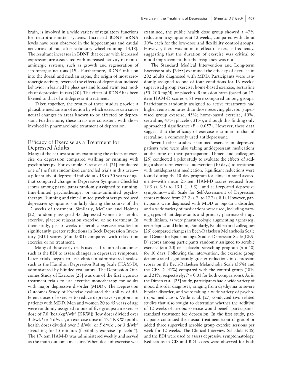 其他几项研究调查了在参与研究时同时服用抗抑郁药物的抑郁症患者的运动情况。Dimeo和他的同事进行了一项初步研究,以评估在抗抑郁药物治疗中加入短期运动干预(10天)的效果。在为期10天的临床分级评估中发现显著的降低,平均21个项目的hamd评分从19.5(plusmn;3.3)分下降到13.1(plusmn;5.5)分,抑郁症状自我报告量表抑郁评分从23.2(plusmn;7)分下降到17.7(plusmn;8.1)分。然而,参与者被诊断为MDD或I型双相情感障碍,并使用了多种药物,包括不同类型的抗抑郁药和锂盐的初级药物治疗,以及药物增强剂(例如,抗精神病药和锂盐)。同样,Knubben和他的同事比较了Bech-Rafaelsen抑郁量表和流行病学研究中心抑郁量表(CESD)的变化,这些参与者被随机分配到有氧运动组(n = 20)或安慰剂拉伸组(n = 18),为期10天。干预后,运动组与对照组(分别为18%和21%)相比,Bech-Rafaelsen抑郁量表(36%)和CES-D量表(41%)的抑郁评分显著降低;两组比较P = 0.01)。在Dimeo等人的研究中,参与者被诊断出多种情绪障碍,从心境恶劣到严重的双相情感障碍不等,并且正在服用多种精神药物。Veale等人进行了两项相关研究,也试图确定增加12周的有氧运动是否有利于参与者的抑郁症标准治疗。在第一项研究中,参与者继续他们通常的治疗(对照组),或在12周内每周增加三次有监督的有氧运动。临床访谈表(CIS)和BDI被用来评估抑郁症状。两组患者的CIS和BDI评分均有所下降,但运动组的患者在第12周的CIS评分明显低于常规护理组。BDI无组间差异;然而,两组在基线测量上存在差异。在第二项研究中,低强度运动(包括拉伸和瑜伽)与第一项研究中的相同有氧干预进行了比较。两种运动都能降低CIS和BDI分数。然而,许多因素使数据的解释变得复杂,包括对运动的不同坚持程度、运动是在组中进行的事实,以及抑郁症严重程度和抗抑郁药物使用的基线组差异。此外,通常的治疗方法差异很大,包括各种抗抑郁药物、苯二氮卓类药物和/或支持性心理治疗。然而,运动改善了那些参与其中的人的结果。