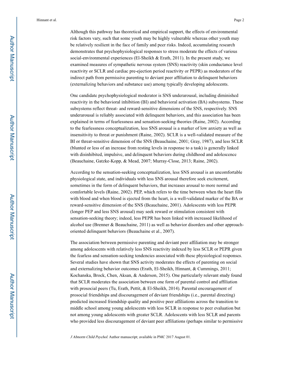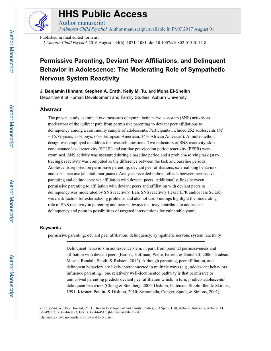 青少年时期的放任型养育、越轨同伴关系和犯罪行为:交感神经系统反应的调节作用外文翻译资料