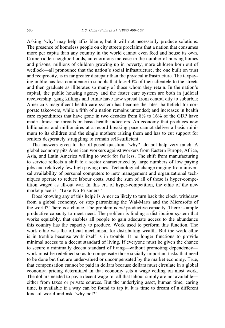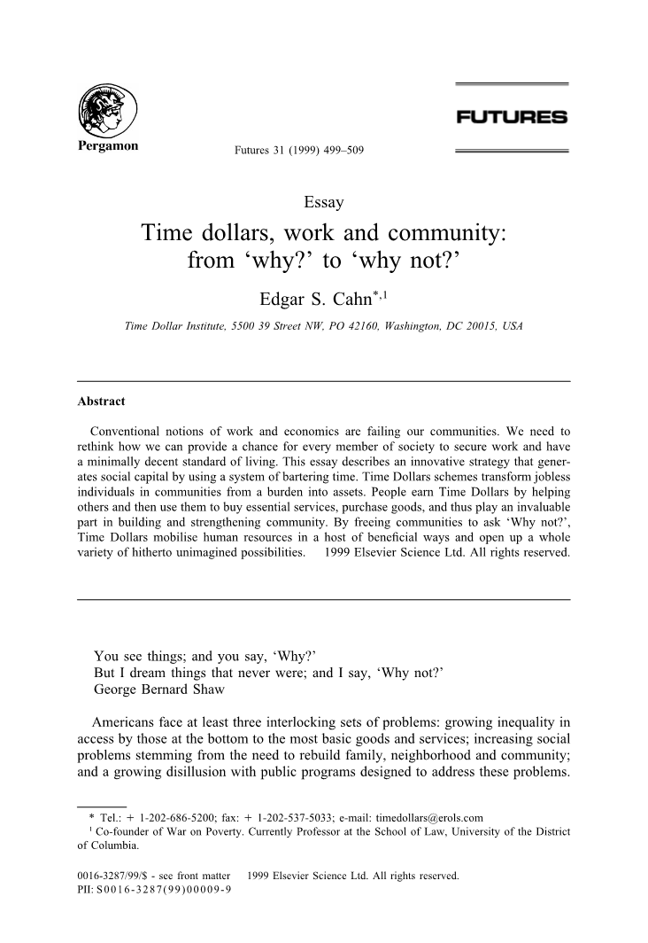 传统的工作和经济观念正在使我们的社区失望。我们需要重新思考如何为社会的每一个成员提供一个获得工作和最低限度体面生活水平的机会。本文描述了一种利用物物交换时间系统产生社会资本的创新策略。时间美元计划将社区失业人员从负担转变为资产。人们通过帮助他人赚取时间美元,然后利用他们购买基本服务、购买商品,从而在建设和加强社区方面发挥了宝贵的作用。让社区自由地问“为什么不?”,时间美元以许多有益的方式调动人力资源,并开辟了各种迄今无法想象的可能性。1999爱思唯尔科学有限公司保留所有权利。