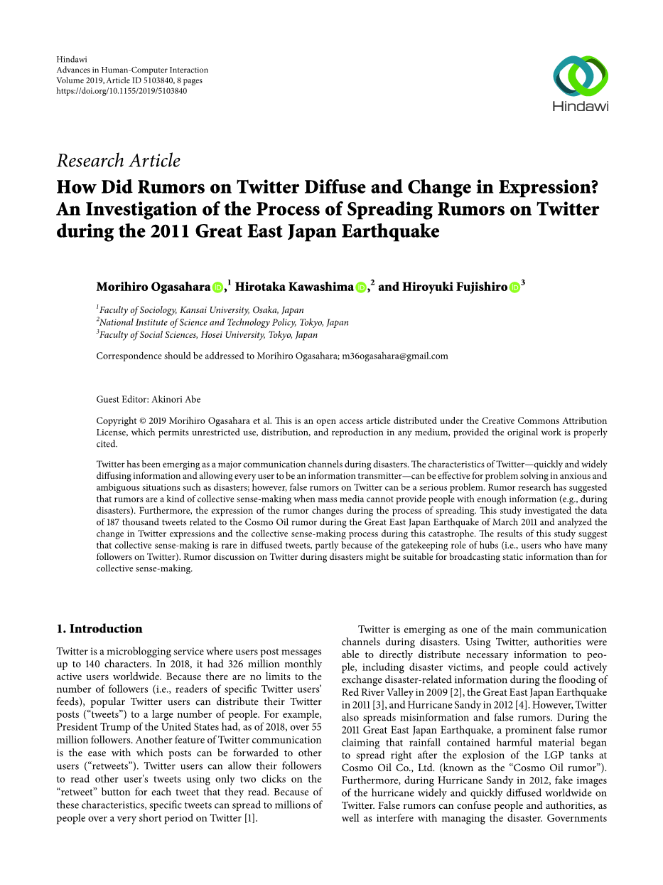 Twitter正在成为灾难期间的主流沟通渠道之一。在2009年红河流域洪灾[2]、2011年东日本大地震[3]和2012年桑迪飓风[4]期间,通过推特,政府当局能够直接向包括灾民在内的人们发布必要的信息,并且民众可以积极交流与灾害相关的信息。然而,推特也传播错误信息和虚假谣言。在2011年东日本大地震期间,一则明显是虚假的谣言声称降雨含有有害物质,在科斯莫石油有限公司的液化石油气储罐爆炸后立即开始传播(被称为“科斯莫石油谣言”(“Cosmo Oil rumor”))。此外,在2012年的飓风桑迪期间,虚假的飓风图像在Twitter上迅速广泛传播。虚假的谣言会迷惑民众和政府当局,对灾难的管理造成干扰。政府已经开始努力应对包括Twitter等社交媒体上传播的虚假谣言。