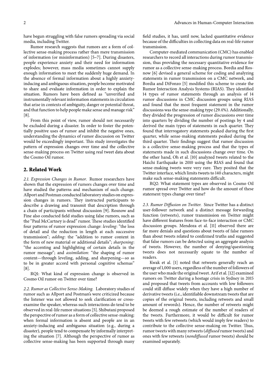 以计算机为媒介的通信(CMC)使研究人员能够记录谣言传播过程中的所有互动,从而为”谣言作为一种集体的意识构建过程“观点提供了必要的定量证据,以此 Bordia和Rosnow [6]设计了一种用于编码和分析CMC网络上的谣言传输语句的通用方案,Bordia和DiFonzo [5]修改了该方案以创建谣言交互分析系统(RIAS)。他们通过RIAS对CMC讨论组中的14个谣言论述进行分析定义了14种谣言表述,并且发现在谣言论述中最常见的陈述是意识构建的陈述(占29.4%)。此外,他们通过将帖子数量除以4来将谣言讨论随时间的变化分成四分之一,并得出每个部分的主要陈述类型。他们发现疑问句在第一部分达到峰值,而意识构建的陈述则在第三部分达到峰值。他们的发现表明,谣言论述是一个集体的意识构建过程,并且这种论述中的言论类型会随着时间变化。另一方面,O. Oh等 [10]使用RIAS分析了与2010年海地地震有关的推文,发现意识构建的的推文非常罕见。他们认为,Twitter界面将tweet限制为140个字符,这可能会使这种意识构建的陈述变得困难。