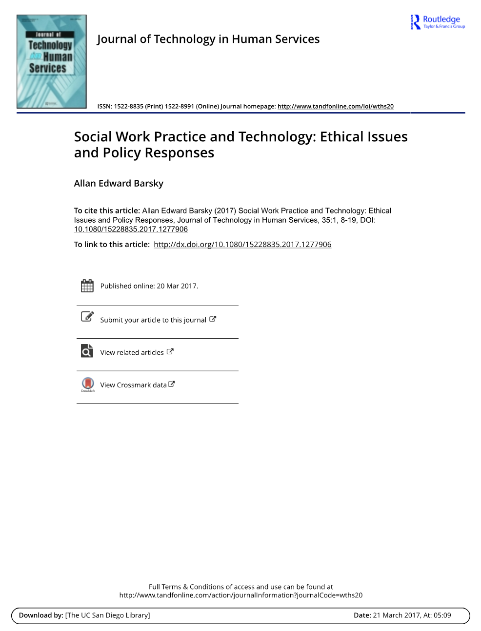 社会工作者在社会工作实践的各个方面使用科学技术,包括在线咨询(Hilty等人,2013; Morgan&Polowy,2012),记录保存(国家社会工作者协会(NASW),2016;国家社会工作者协会)社会工作委员会协会(2005),教育(Judd&Johnston,2012),社区发展(Brady,McLeod,&Young,2015)和宣传(Belluomini,2014)。社会工作者使用的科学技术类型从座机电话和传真机到智能手机,计算机,平板电脑,视频会议,电子邮件,社交网络,化身(Leff,Williams,Huckvale,Arbuthnot和Leff,2014),移动社交工作应用程序( Barsky,2016年),机器人和生物反馈(Marsch,Lord和Dallery,2015)。随着设备和应用程序类型的不断增长,社会工作道德规范和实践标准必须努力保持关联性和时效性。在美国,主要的社会工作协会最后一次发布有关技术使用的准则社会工作实践是2005年(全国社会工作者协会和社会工作委员会协会,2005)。那时,诸如Facebook和YouTube之类的社交网络程序仍处于起步阶段,很少有人想到案主可能会在虚拟世界中与计算机生成的社交工作者进行交互。 NASW道德规范的最后一次重大修订是在1996年,当时智能手机和平板电脑还没有出现。幸运的是,这些实践标准和道德标准正在不断更新中(NASW,2016)。尽管新标准和道德规范应为社会工作者提供有关如何以有效和道德的方式使用科学技术的有用指导,但社会工作者和社会工作机构也有责任更新和制定适用于其特定实践环境的技术原则。尽管职业道德守则需要涵盖所有形式的社会工作实践,但机构原则可以针对特定形式的实践和机构内技术的使用。 机构原则也可以比职业道德规范更定期地更新。 本文重点介绍了制定此类原则时应考虑的七个关键领域:科学技术的好处,保密性,知情同意,社会工作者与案主的界限,案主的安全性,尊重和跨领域实践。