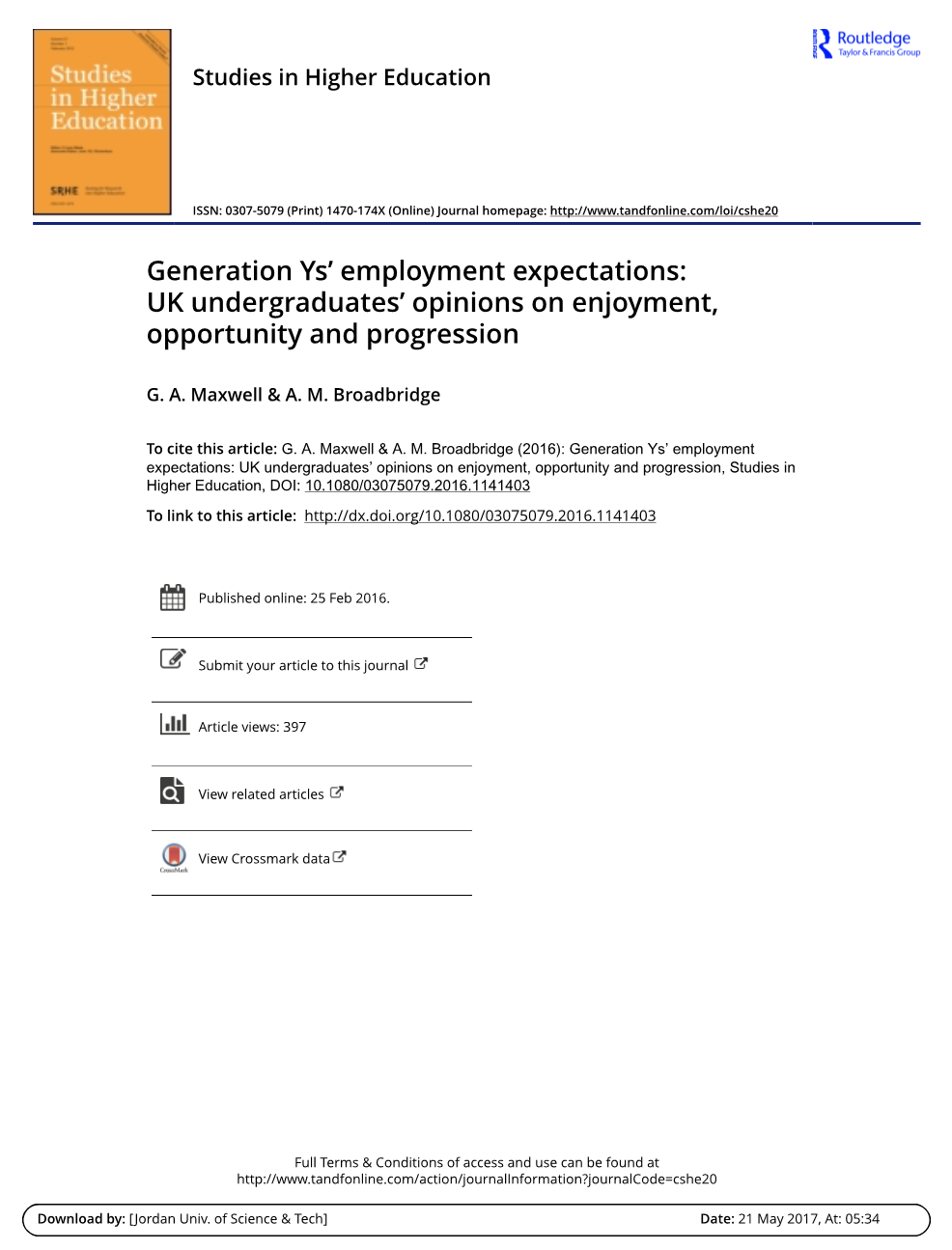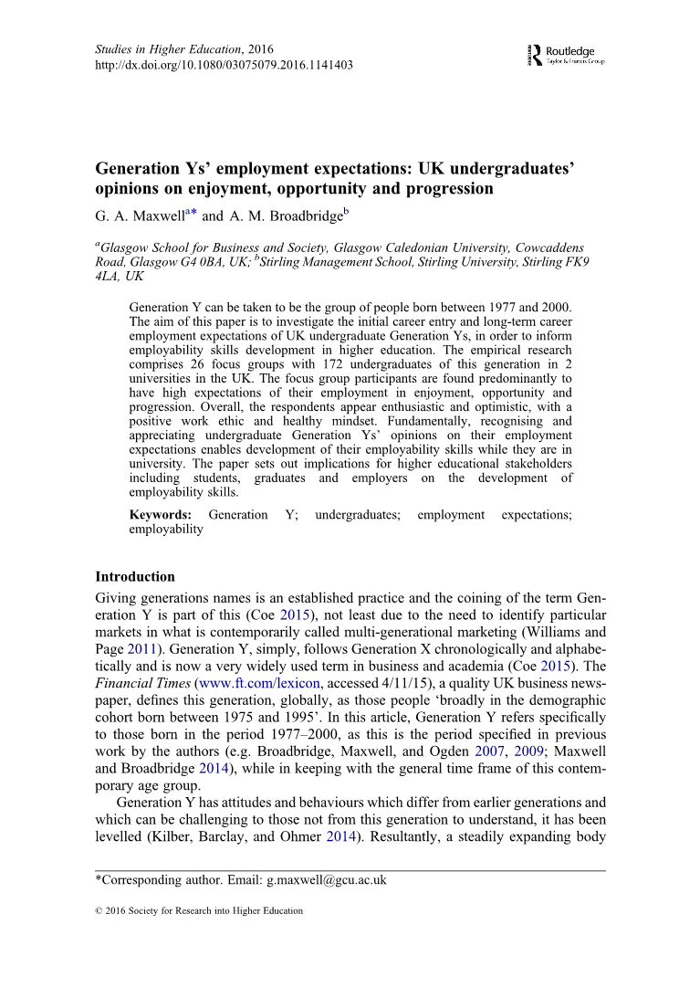 引用这篇文章:G.A.麦克斯韦& A.M.布罗德布里奇(2016):Y世代的就业期望:英国大学生对娱乐,机会和发展的看法,高等教育研究,DOI:10.1080 / 03075079.2016.1141403