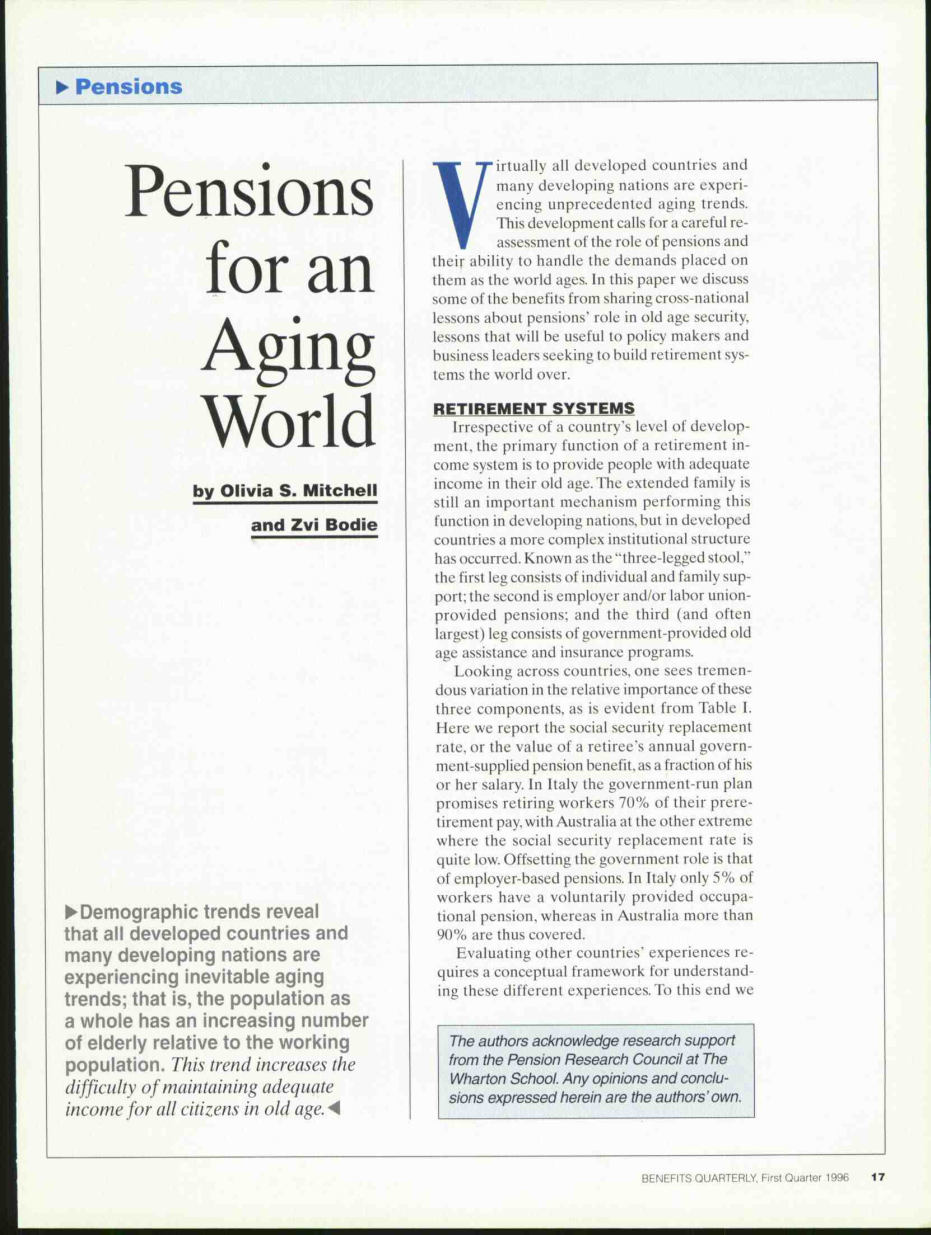几乎所有发达国家和许多发展中国家都在经历着史无前例的人口老龄化。这一发展趋势呼吁我们重新仔细评估养老金的作用以及养老金在人口老龄化趋势中解决随之而来的各种需求的能力。在这篇论文中,我们讨论一些优势,这些优势来源于国家与国家之间分享关于养老金在养老保险中的作用的相关经验。这些经验对政策制定者和商界领导人们试图建立全球化的退休机制有很大作用。