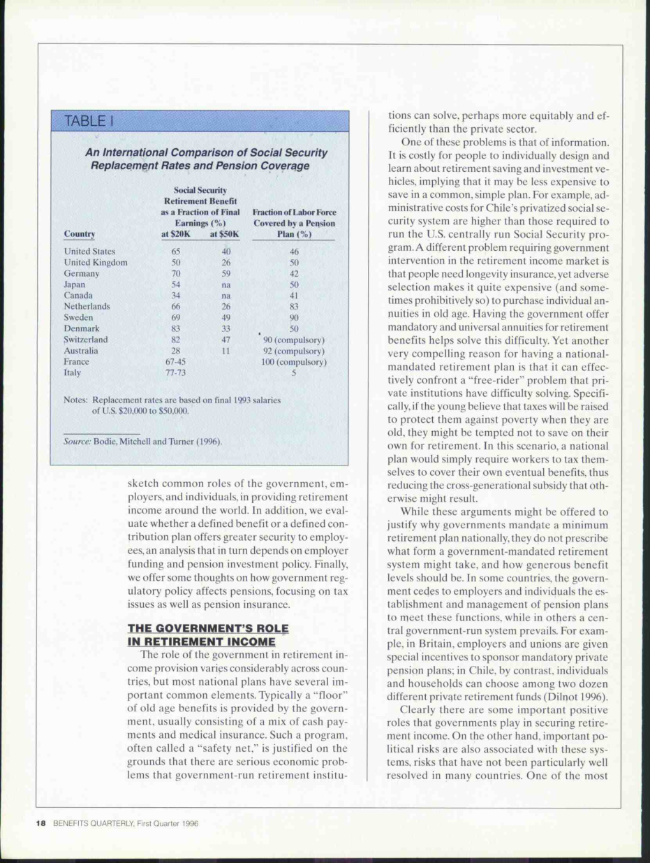 这些问题中的一个是信息。对人们来说,通过个人设计并了解退休储蓄和投资运载方式代价高昂,暗示着储蓄在一个简单普遍的计划里会更便宜。比如说,智力的私人社保机制的行政开支比美国中央政府运营的社保机制需要得多。需要政府在退休收入市场插手的另一个问题是人们需要长期的保障,而不是使人们在年老时花更多的钱购买个人年金的相反的选择。政府向退休福利提供广泛的义务年金能够解决这个问题。另一个十分引人注目的建立全国义务退休计划的理由是这一机制能够有效应对“搭便车”的问题,而这一问题正是私立机构无法解决的。讲得明白一点,如果年轻人相信国家提高税收是为了使他们年老时远离贫穷,他们可能会被诱使着不为退休而自己存钱。在这个方案下,一个全国性的计划将不仅仅需要工人们自己承受税收重担来保证他们自己最终的利益,而且跨代补贴的减少也可能因此发生。