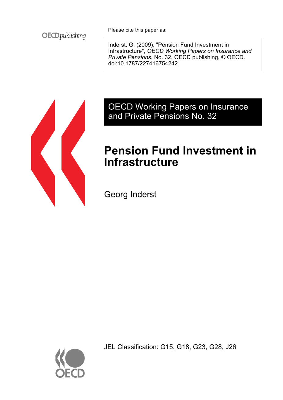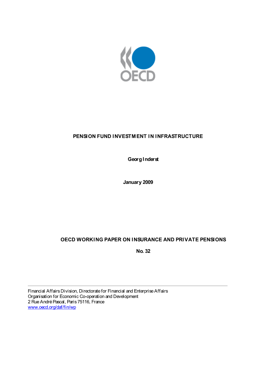 由于基础设施投资持续增长的需要,对基础设施项目融资的私人部门已经在世界各地发展起来。考虑到长期增长和(潜在的)基础设施投资的低相关性方面,他们也对养老基金表现出浓厚兴趣。这些投资项目范围广泛,从经济基础设施如交通,社会项目,如医院,并涉及不同形式的融资(初级与次级债务与股权私募与上市,直接与间接)。因此,数据解释这个多样化的资产类别的规模,风险,收益和相关性是有限的,这可能使得养老基金的投资者持谨慎态度。这样的资产投资给出还涉及新型的投资工具和风险养老基金管理,如接触杠杆,法律和所有权问题,环境风险以及监管和政治挑战,这种谨慎是合理的。但是,如果政府希望帮助基础设施开发进军,可以在养老基金融资的潜在的重要来源采取一定的措施。