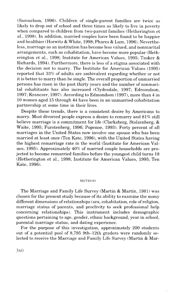 婚姻对成人和孩子都有显著的优势。已婚人士比单身人士有更高的收入,资产也更多。(Samuelson, 1996)。与单亲家庭的孩子相比,单亲家庭的孩子辍学的可能性和贫困生活的可能性是前者的两倍(Hetherinton et al.,1998)。此外,已婚夫妇也被发现更快乐、更健康(Horwitz amp; White, 1998; Phares amp; Lum, 1996)。然而,婚姻作为一种机构的价值变得越来越低,非婚姻安排,如同居,也变得越来越受欢迎((Hetherington et al., 1998; Institute for American Values, 1995; Tasker amp; Richards, 1994)。此外与决定不结婚有关的耻辱感也较少。美国价值观研究所(1995 )报告说,33%的成年人对结婚是否比单身更好持矛盾态度。在过去的30 年里,未婚人士的总比例有所上升,非婚同居者的数量也在增加(Clydesdale, 1997; Edmondson, 1997; Kranczer, 1997)。根据埃德蒙森(1997)的数据,十几位15 至44岁的女性中有4人曾经未婚同居。