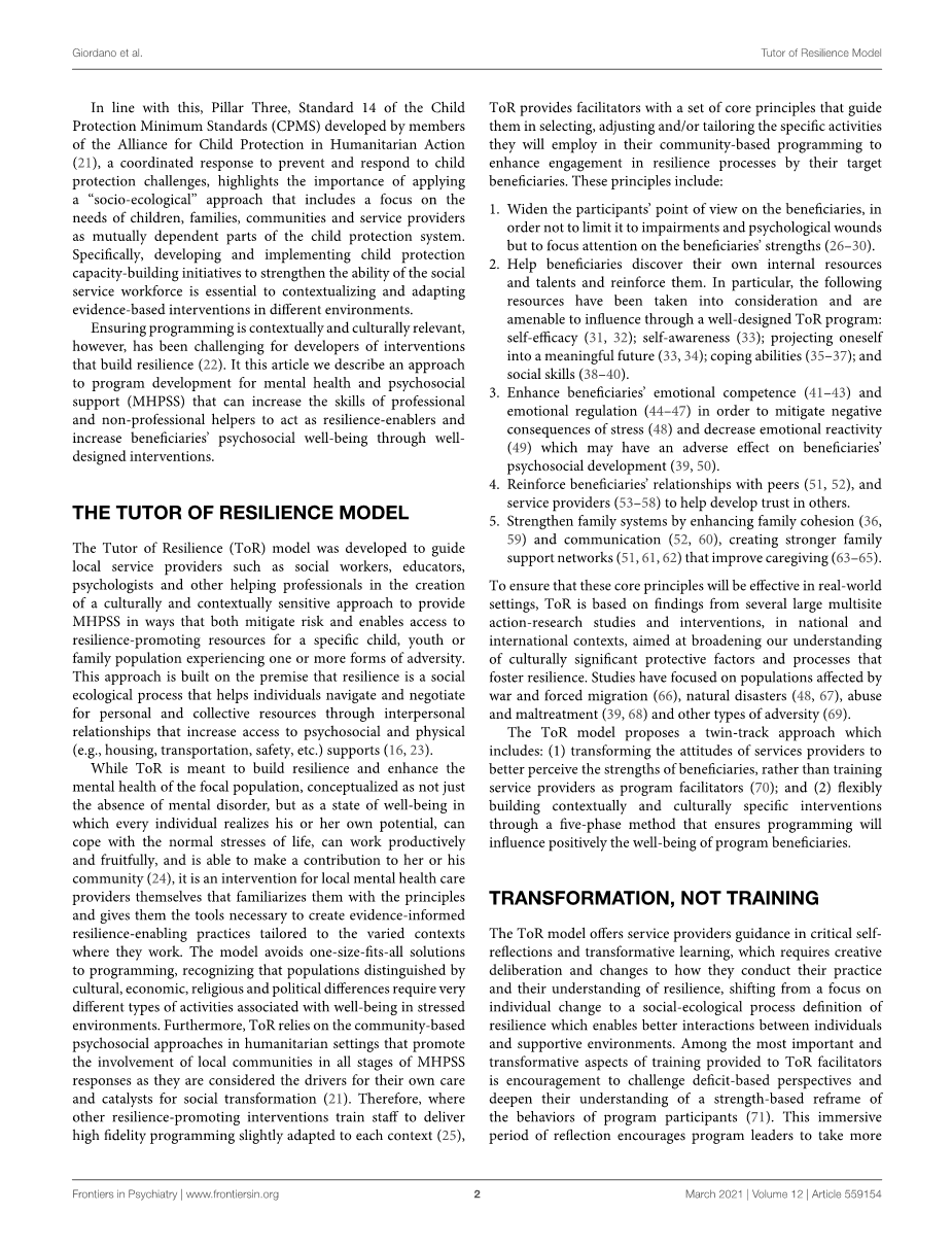 为了确保这些核心原则在现实世界环境中有效,ToR 基于国家和国际背景下的若干大型多地点行动研究和干预措施的调查结果,旨在扩大我们对培养抗逆力的文化重要保护因素和进程的理解。研究的重点是受战争和强迫移徙影响的人口(66)、自然灾害(48、67)、虐待和虐待(39、68)和其他类型的逆境(69)。