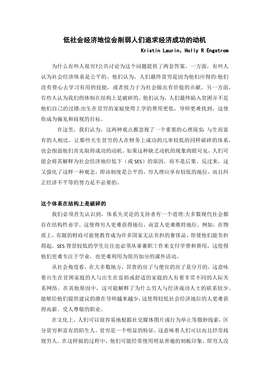 The context of low socioeconomic status can undermine peoplersquo;s motivation for financial success