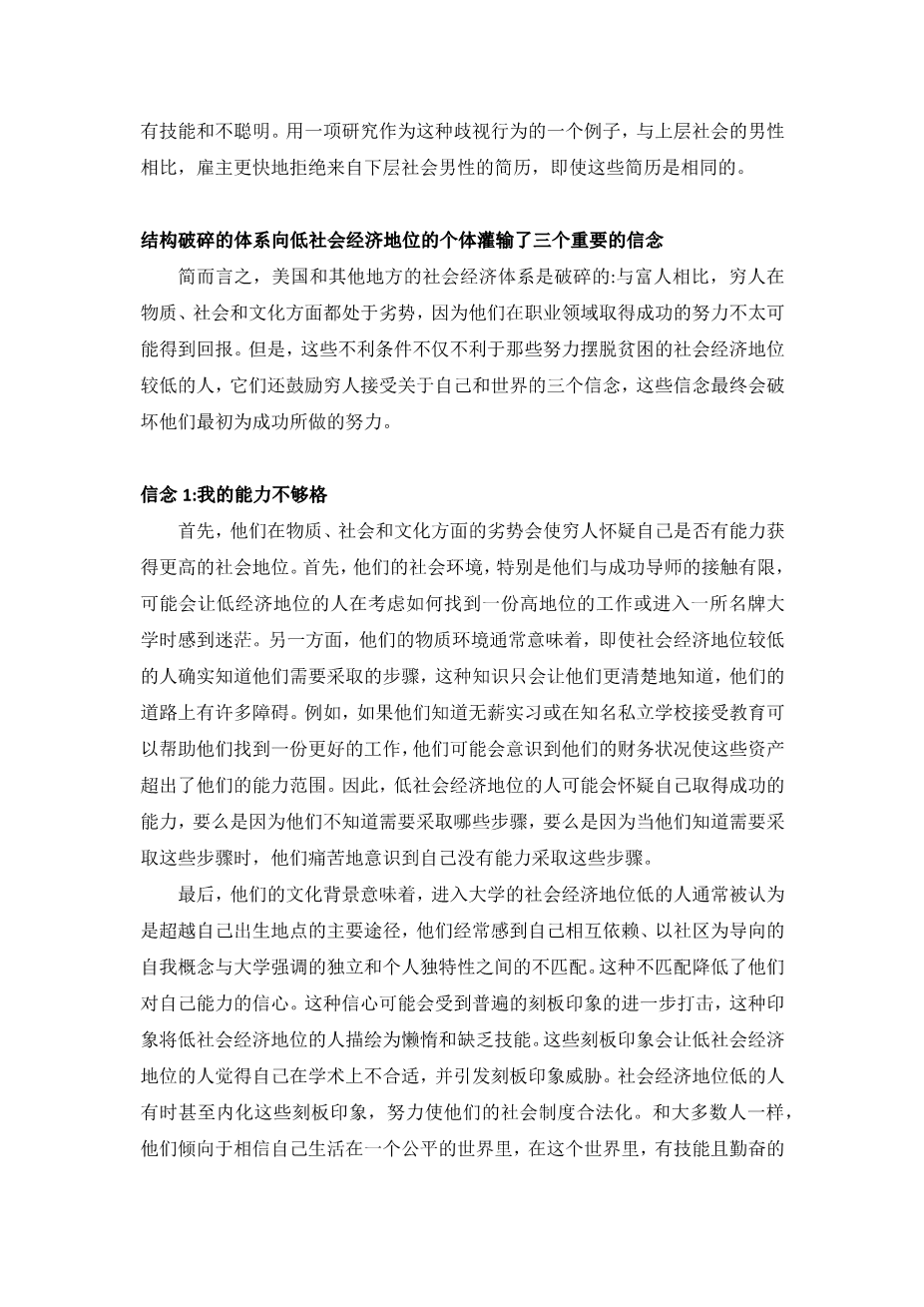 First, their material, social, and cultural disadvantages can cause the poor to doubt that they are competent enough to achieve higher social status. For one thing, their social context, and specifically their limited access to successful mentors, may leave low SES people feeling lost when considering how to land a high-status job or get into a prestigious university . For another, their material context often means that, even if lower SES individuals do know the steps they need to take, this knowledge only makes plainer that there are many obstacles in their way. For example, if they know that an unpaid internship or an education at a prestigious private school would help them land a better job, they likely recognize that their finances place these assets out of their reach . Thus, low SES people may doubt their ability to get ahead either because they do not know the steps required, or because when they do, they are painfully aware of their inability to take these steps.