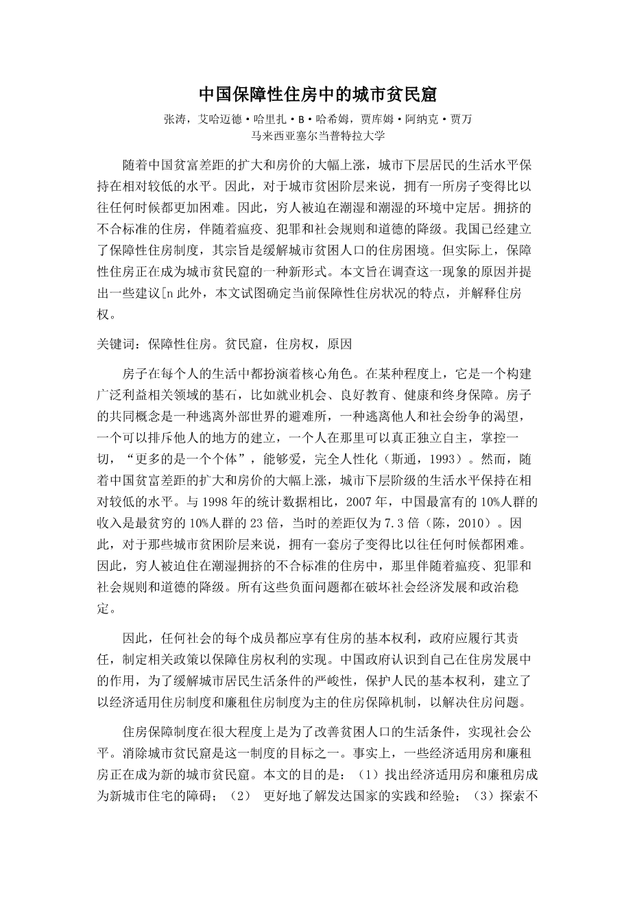 House plays a central role in life of every human being. It is to some extent a building block for a broadrealm of interrelated benefits, like job opportunities, good education, health, and tenure security. The commonnotion of the house is a refuge from the outside world, a desire to escape from other people and from socialinvolvement, the establishment of a place from which others could be excluded, and where consequently onecould truly be onself, in control, 'more of an individual', capable of loving, and fully human (Stone, 1993).However, as wealth gap is widening and the housing price increases tremendously in China, the livingstandard of urban underclass maintains relatively low level. The income of the top 10 percent of the richestChinese was 23 times that of the bottom 10 percent of in the country in 2007, as compared with the statistics in1998, when the gap was only 7.3 times (Chen, 2010). Therefore, possessing a house is becoming more difficultthan ever for those urban poor strata. Consequently, the poor are forced, to settle in damp and congestedsubstandard housing where plagues, crimes and relegation of social regulations and morality are incidental with.All these negative issues are undermining the social economic development and political stability.