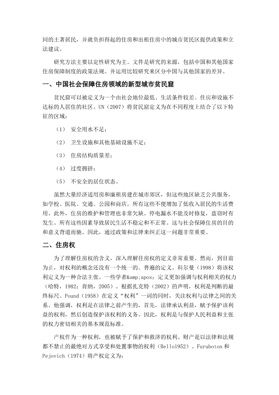 As wealth gap is widening and the housing price increases tremendously in China, the living standard of urbanunderclass maintains relatively low level. Therefore, possessing a house is becoming more dificult than ever forthose urban poor strata Consequently, the poor are forced to settle in damp and . congested substandard housingwhere plagues, crimes and relegation of social regulations and morality are incidental with. Security housingsystem has been established in China, and its purport is to alleviate the housing plight of urban poor people. But inrcality, security housing is becoming a new form of urban slum. This paper aims to investigate the causes of thisphenomenon and provide some recommendations [n addition, this paper attempts to identify the characteristics ofcurrent security housing situation and to interpret the right to housing.