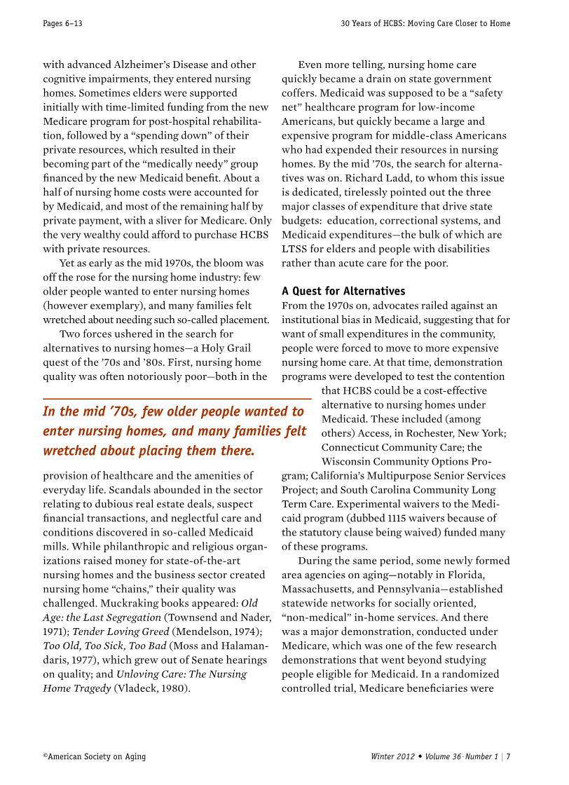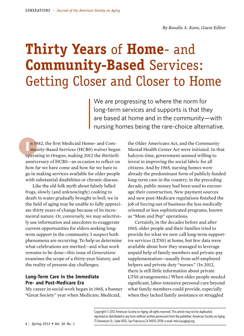 这里的文章不仅回顾过去三十年,还展望未来。最初的历史观点来自作者Terence Ng和Charlene Harrington(第14页)。他们澄清,尽管目前的数据来源允许,在过去的30年中使HCBS可供长者使用取得实质性进展。