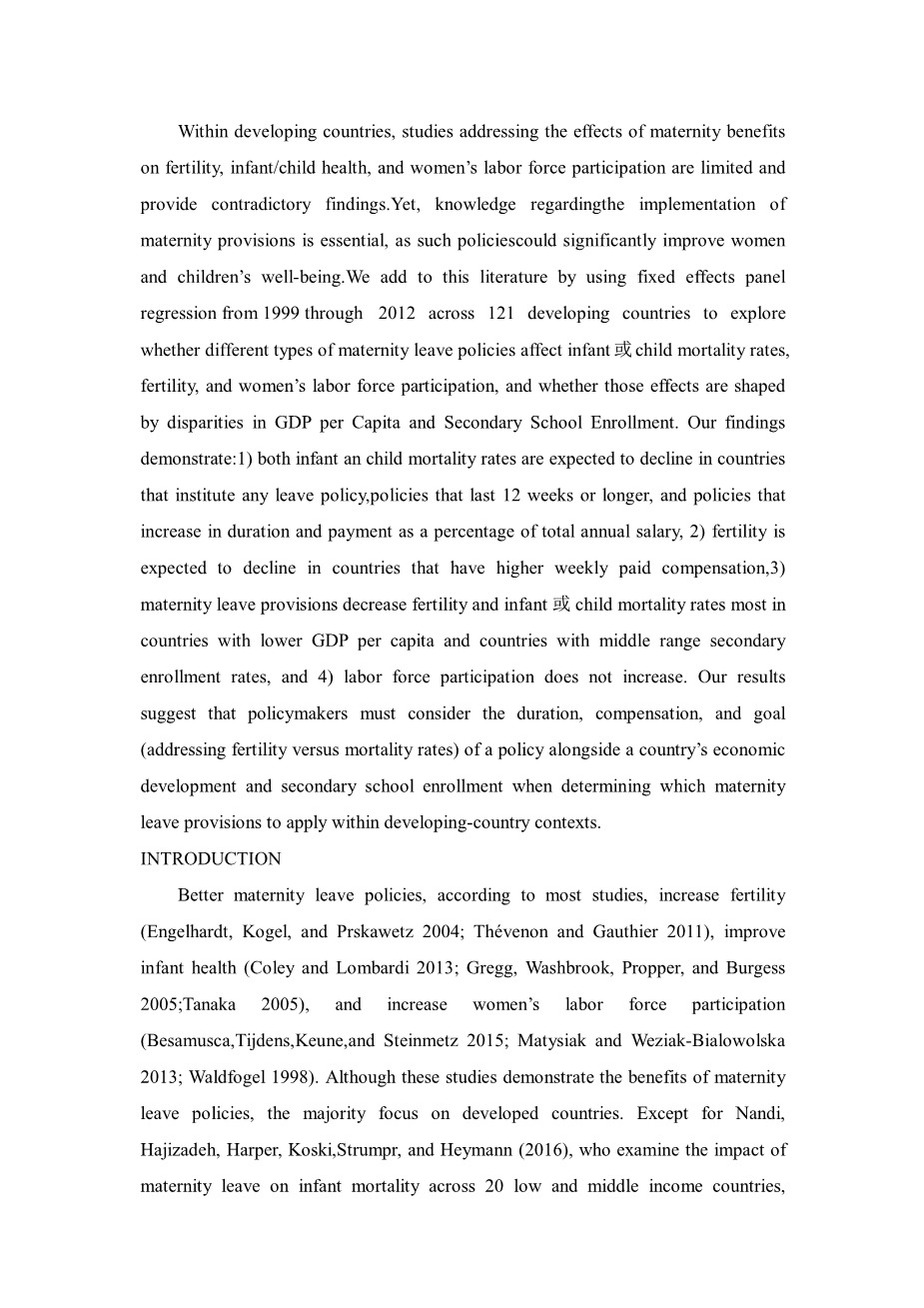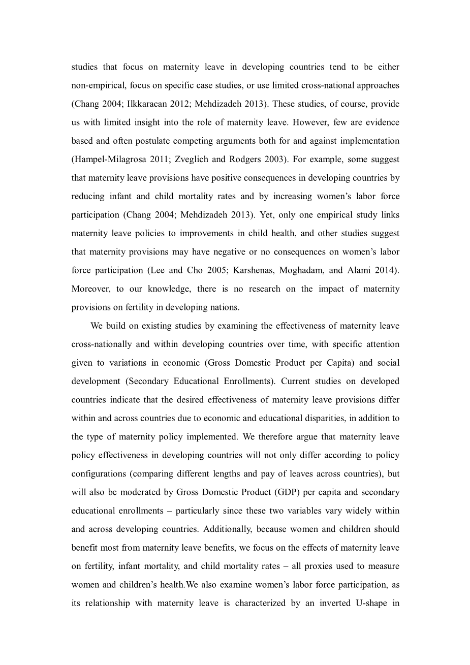 Better maternity leave policies, according to most studies, increase fertility (Engelhardt, Kogel, and Prskawetz 2004; Theacute;venon and Gauthier 2011), improve infant health (Coley and Lombardi 2013; Gregg, Washbrook, Propper, and Burgess 2005;Tanaka 2005), and increase womenrsquo;s labor force participation (Besamusca,Tijdens,Keune,and Steinmetz 2015; Matysiak and Weziak-Bialowolska 2013; Waldfogel 1998). Although these studies demonstrate the benefits of maternity leave policies, the majority focus on developed countries. Except for Nandi, Hajizadeh, Harper, Koski,Strumpr, and Heymann (2016), who examine the impact of maternity leave on infant mortality across 20 low and middle income countries, studies that focus on maternity leave in developing countries tend to be either non-empirical, focus on specific case studies, or use limited cross-national approaches (Chang 2004; Ilkkaracan 2012; Mehdizadeh 2013). These studies, of course, provide us with limited insight into the role of maternity leave. However, few are evidence based and often postulate competing arguments both for and against implementation (Hampel-Milagrosa 2011; Zveglich and Rodgers 2003). For example, some suggest that maternity leave provisions have positive consequences in developing countries by reducing infant and child mortality rates and by increasing womenrsquo;s labor force participation (Chang 2004; Mehdizadeh 2013). Yet, only one empirical study links maternity leave policies to improvements in child health, and other studies suggest that maternity provisions may have negative or no consequences on womenrsquo;s labor force participation (Lee and Cho 2005; Karshenas, Moghadam, and Alami 2014). Moreover, to our knowledge, there is no research on the impact of maternity provisions on fertility in developing nations.