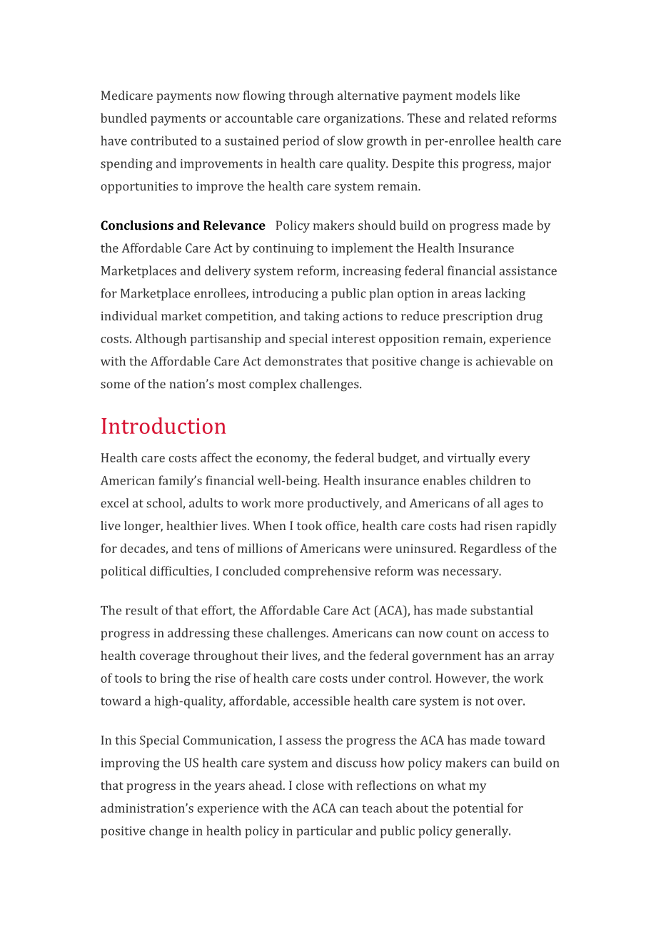在这次特别交流中,我评估了ACA在改善美国医疗体系方面所取得的进展,并讨论了政策制定者如何在未来几年继续推进这一进展。最后,我想谈谈我的政府在ACA方面的经验,对卫生政策,特别是公共政策的潜在积极变化有何启示。