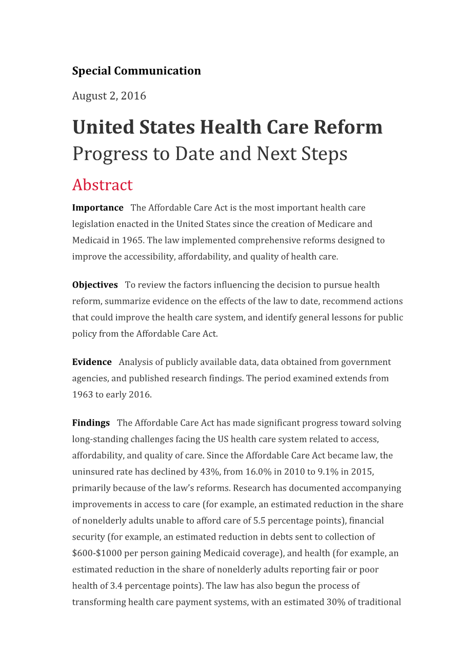 调查结果《合理医疗费用法案》在解决美国卫生保健系统长期面临的与可获得性、可负担性和医疗质量相关的挑战方面取得了重大进展。自《平价医疗法案》(Affordable Care Act)成为法律以来,未参保率已下降43%,从2010年的16.0%降至2015年的9.1%,这主要是由于该法案的改革。研究记录伴随改善访问护理(例如,估计减少老年成年人无法负担的份额的5.5),金融安全(例如,估计减少债务送到收集的600 - 1000美元每人获得医疗补助覆盖),和健康(例如,估计减少老年成年人的比例公平或健康状况不佳的3.4)。该法还开始了医疗支付体系改革的进程,据估计,30%的传统医疗保险支付现在通过捆绑支付或负责任的医疗机构等替代支付模式进行。这些改革以及相关的改革,使每名参保者的医疗保健支出持续增长缓慢,并改善了医疗保健质量。尽管取得了这些进展,改善卫生保健系统的重大机会仍然存在。